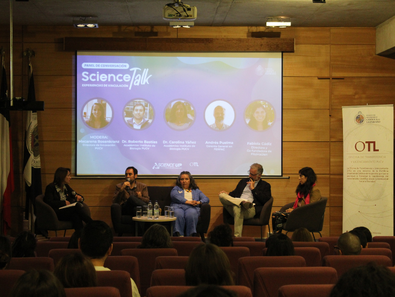 La jornada, realizada en el Campus Curauma de la Facultad de Ciencias y que reunió a más de 80 participantes, incluyó diversas actividades, entre ellas un panel de conversación con destacados exponentes de la academia, la industria y del ámbito de la innovación y el emprendimiento de base científica-tecnológica. Durante el panel, los participantes pudieron compartir sus experiencias, desafíos y los beneficios que surgen de la vinculación entre la universidad y el sector productivo.