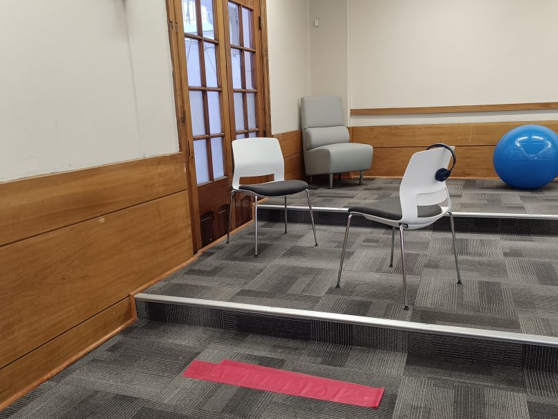 Las personas que ingresen a la sala cuentan con audífonos aislantes de ruido que pueden conectar a música de su gusto, así como bandas elásticas para estirar y pelotas inflables que permiten entregar un espacio de autorregulación.