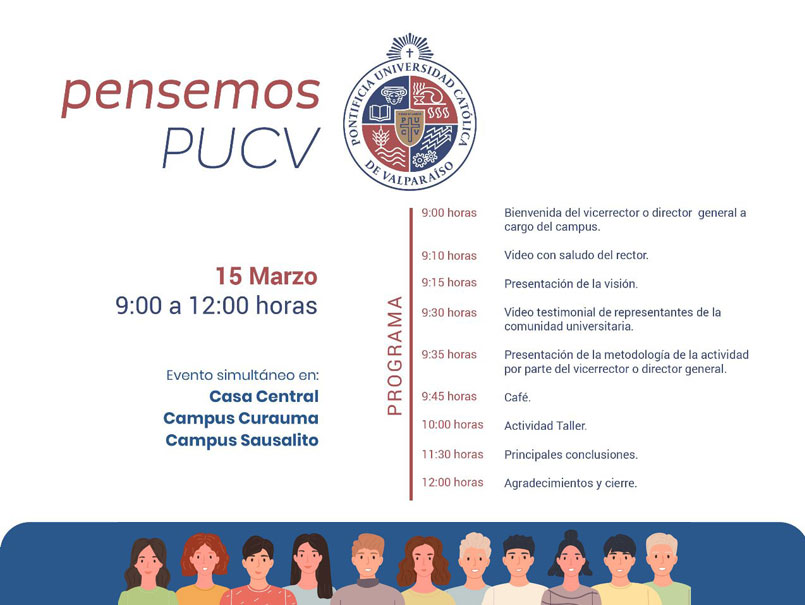 El miércoles 15 de marzo, de 9 a 12 horas, se desarrollará la jornada participativa de trabajo Pensemos PUCV en tres sesiones simultáneas que se desarrollarán en Sausalito, Curauma y Casa Central.