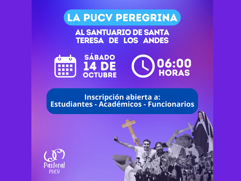 La Pastoral de la Pontificia Universidad Católica de Valparaíso invita a académicos, funcionarios y estudiantes a la Peregrinación al Santuario de Santa Teresa de los Andes, a realizarse el sábado 14 de octubre, caminando desde Chacabuco al Carmelo, o bien participando de las actividades en el Santuario a la espera de los peregrinos.