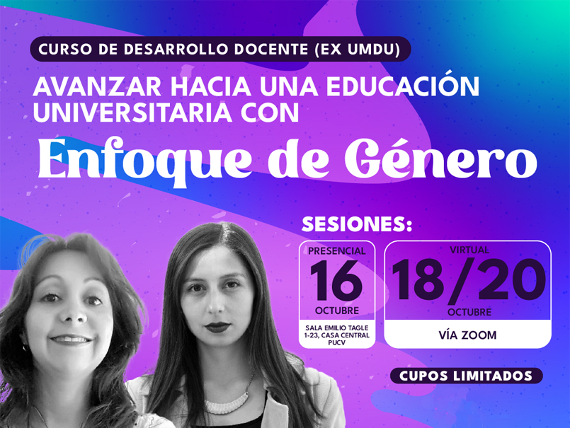 El Eje de Liderazgo y Participación Femenina (LPF) del Consorcio Science Up y el Proyecto InES Género de la Pontificia Universidad Católica de Valparaíso ponen a disposición de la comunidad académica el curso del Programa de Desarrollo Docente, “Avanzar hacia una educación universitaria con Enfoque de Género”, que se realizará el 16 de octubre y cuyas inscripciones estarán abiertas hasta el viernes 13 de octubre.