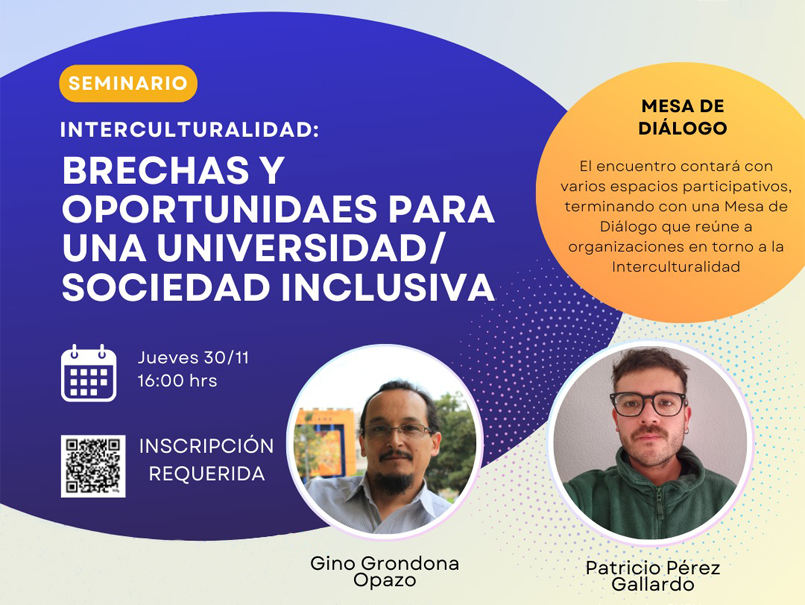 El jueves 30 de noviembre, a partir de las 16 horas, se realizará en el Auditorio de la Escuela de Ingeniería Química (Avenida Brasil 2162, Valparaíso) el seminario “Interculturalidad: brechas y oportunidades para una universidad/sociedad más inclusiva”, encuentro organizado por el Programa de Interculturalidad de la Dirección de Inclusión de la PUCV.