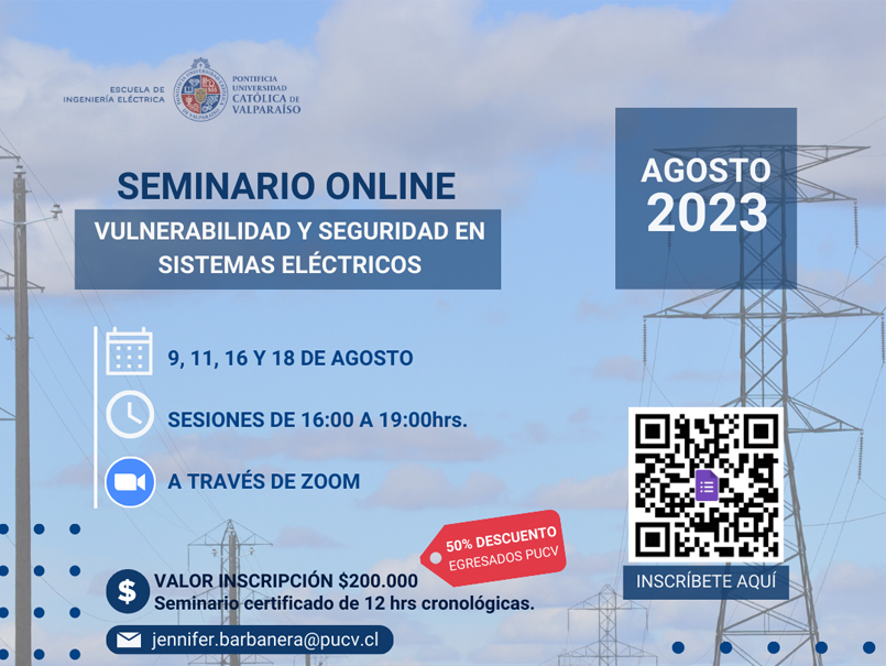 Durante el mes de agosto se impartirá el seminario online “Vulnerabilidad y Seguridad en Sistemas Eléctricos”, organizado por la Escuela de Ingeniería Eléctrica de la PUCV y que estará dirigido a profesionales, académicos(as) e investigadores(as) relacionados con el área.