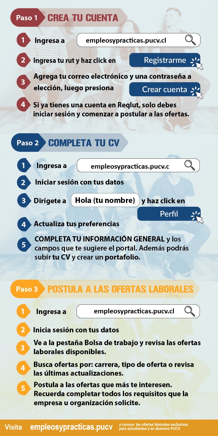 Te invitamos a ingresar a empleosypracticas.pucv.cl, completar tu perfil y comenzar a postular a las ofertas de prácticas y empleos exclusivas para estudiantes y egresados/as PUCV. Esta plataforma es administrada por la Red Alumni PUCV, si tienes consultas, no dudes en escribirnos a alumni@pucv.cl.