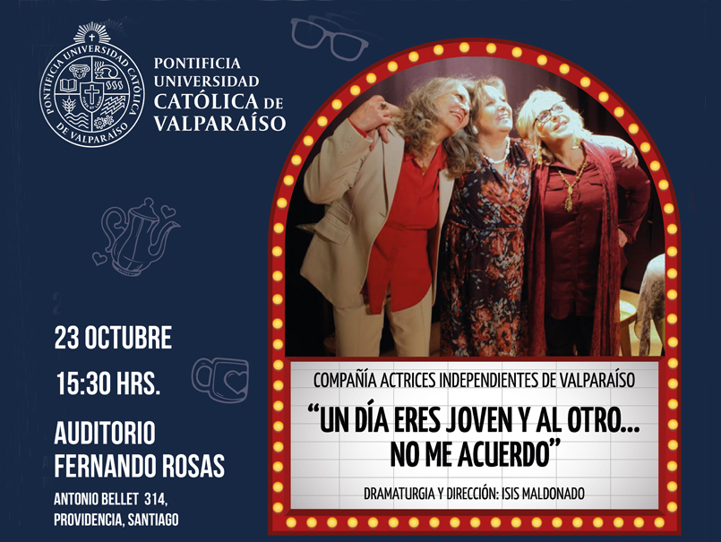 El lunes 23 de octubre, a las 15.30 horas en el Auditorio Fernando Rosas de CEA-PUCV Santiago, se exhibirá la obra de teatro "Un día eres viejo y al otro...no me acuerdo", comedia protagonizada por Flor Marina Acevedo, Ximena Vidal y Alejandra Perales, quienes forman parte de la Compañía de Actrices Independientes de Valparaíso.