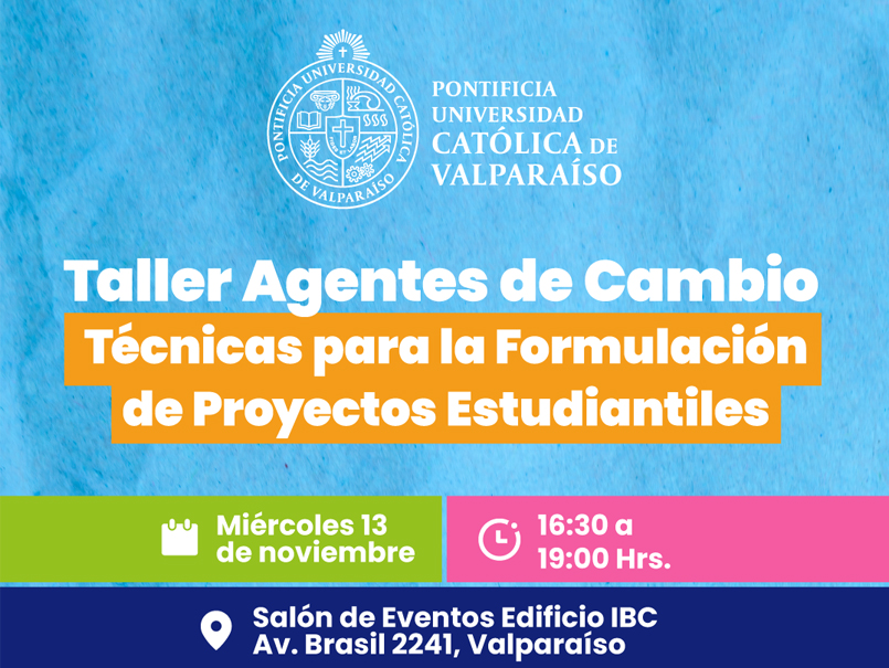 El miércoles 13 de noviembre, entre las 16.30 y 19 horas en el Edificio IBC (Avenida Brasil 2241, Valparaíso), se realizará el taller “Agentes de Cambio: Técnicas para la formulación de proyectos estudiantiles”. En la oportunidad, expondrá Pablo Zamora, coordinador de Innovación y Emprendimiento de la Dirección de Innovación de la VINCI.