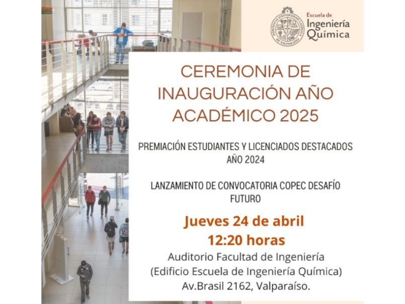 La Escuela de Ingeniería Química realizará la Inauguración del Año Académico 2025, el próximo jueves 24 de abril a las 12.20 horas, en el Auditorio de la Facultad de Ingeniería (Avenida Brasil #2162, Valparaíso).
