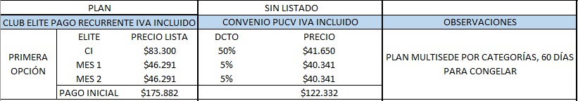 Plan de pago directo por los 3 meses, donde el pago único y total puede ser realizado con tarjeta de crédito en 3 cuotas, débito o transferencia. El titulado debe elegir sólo una sede, que puede ser Valparaíso, Viña del Mar o Montemar.