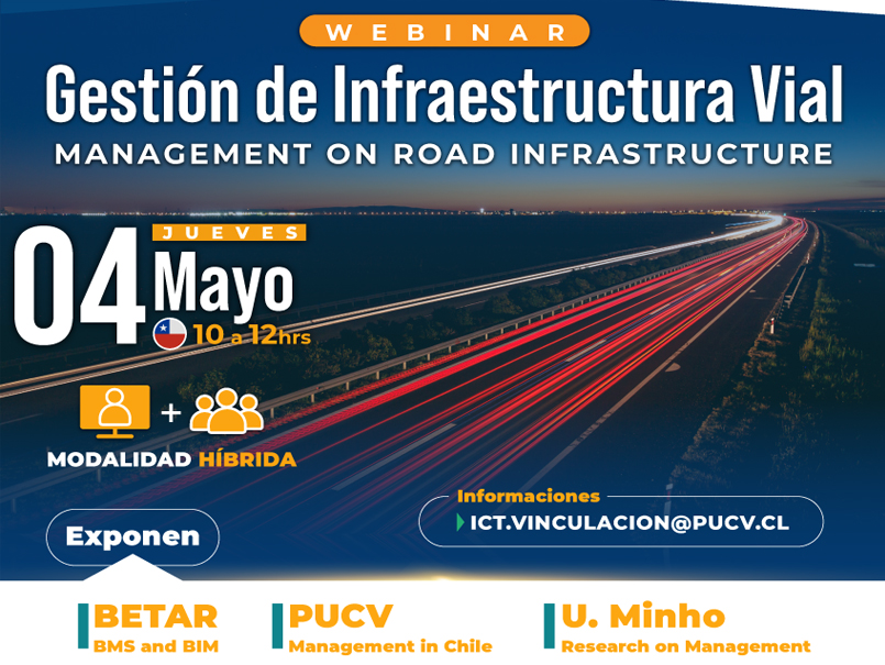 La Escuela de Ingeniería de Construcción y Transporte de la Pontificia Universidad Católica de Valparaíso realizará el webinar Gestión de Infraestructura Vial, a realizarse el jueves 4 de mayo, a partir de las 10 horas en modalidad híbrida.