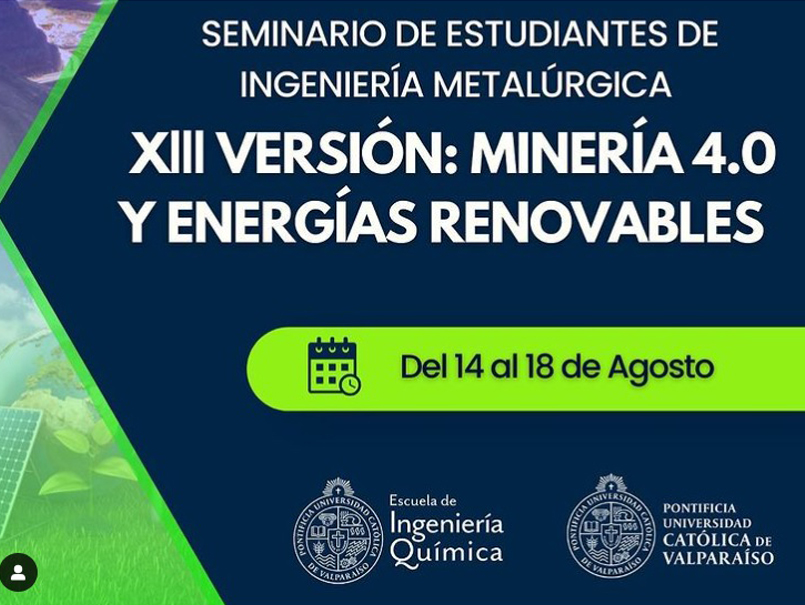 Entre el lunes 14 y viernes 18 de agosto se llevará a cabo el XIII Seminario de Estudiantes Ingeniaría Metalúrgica (SIM PUCV), organizado por alumnos de la carrera de Ingeniería Civil en Metalurgia Extractiva de nuestra Universidad.