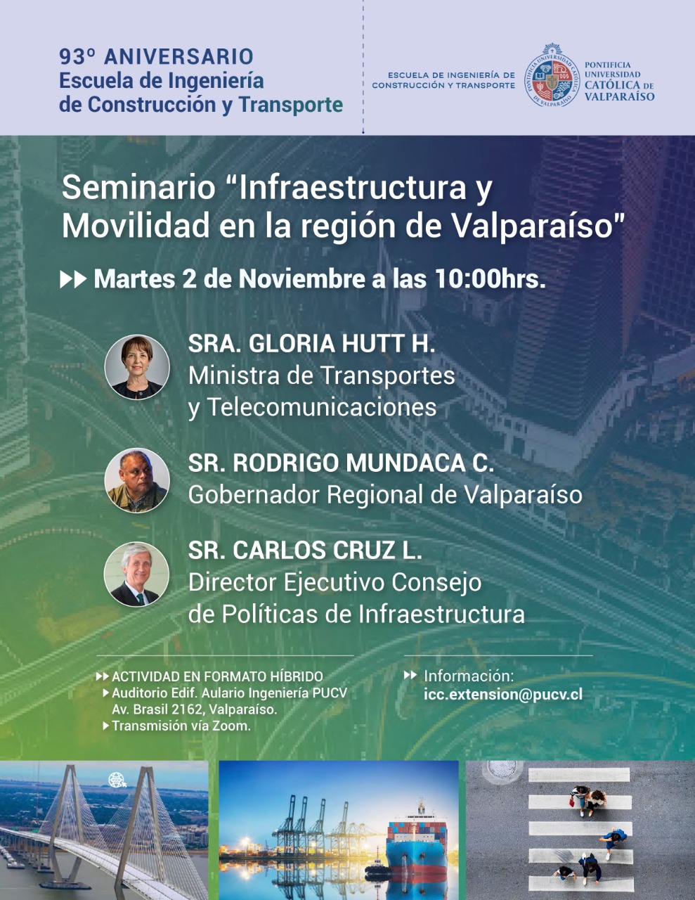 Usted está en: Portada | Escuela de Ingeniería en Construcción | Seminarios 93° Aniversario Escuela de Ingeniería de Construcción y Transporte Seminario "Infraestructura y Movilidad en la Región de Valparaíso" INSCRIPCIONES Twittear subir volver