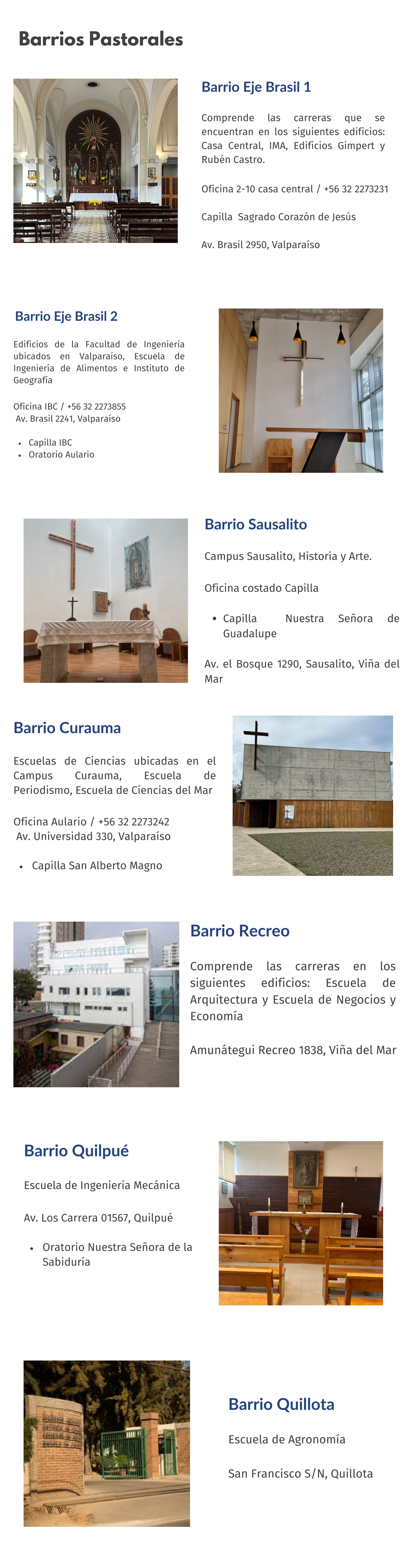 Usted está en: Portada | Pastoral PUCV Barrios Pastorales Los barrios pastorales, son “unidades territoriales en las cuales se agrupan distintas sedes de la PUCV, donde la Pastoral desarrolla su misión, de manera descentralizada e interdisciplinaria”. Twittear subir volver