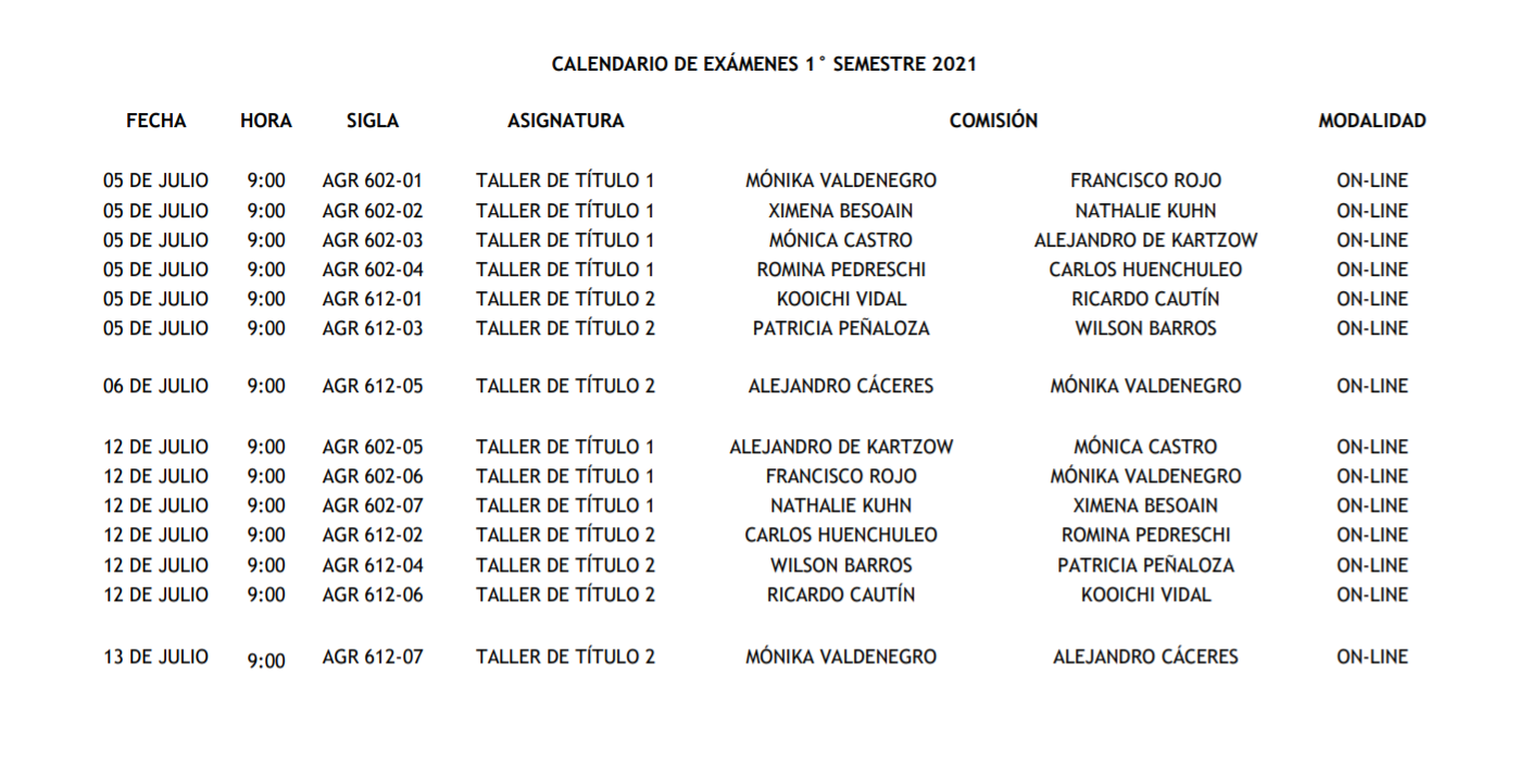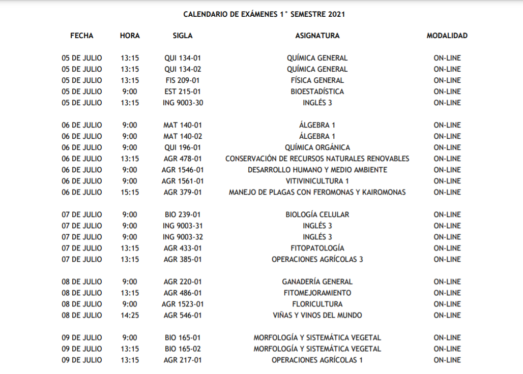 Jefatura de Docencia informa que ya se encuentran disponibles los calendarios de exámenes correspondientes al 1° semestre 2021. La modalidad de cada examen, oral o escrita, será informada directamente por el docente a cargo de la asignatura.