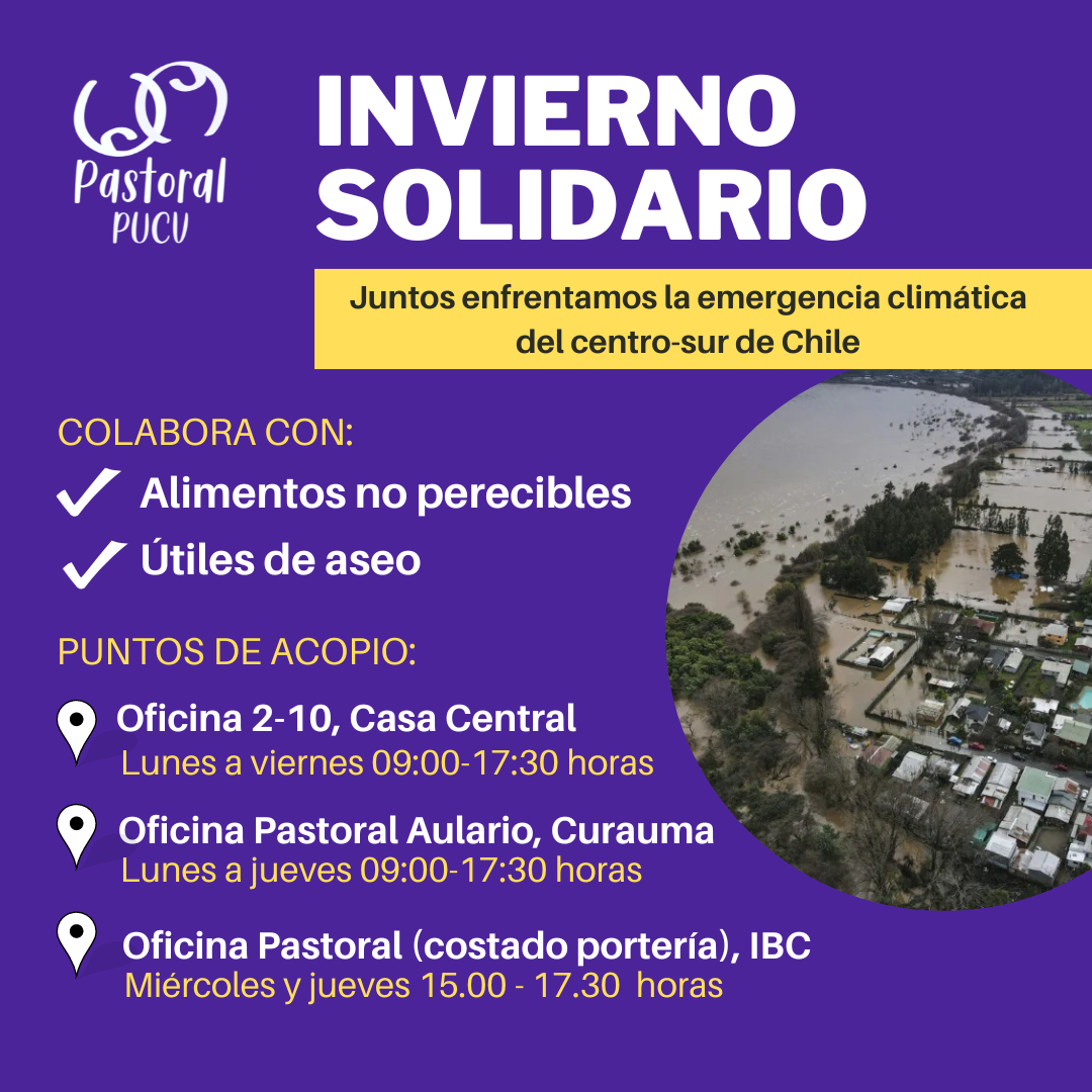 La Pastoral PUCV los invita a unirse a la Campaña "Invierno Solidario", que está dirigida a ir en ayuda de las familias afectadas tras las inundaciones recientes en gran parte de la zona centro-sur de nuestro país.