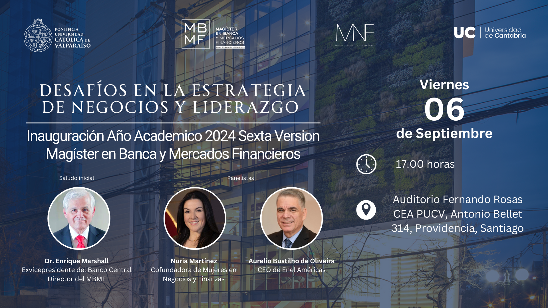 En primera instancia, el Exvicepresidente del Banco Central y director del MBMF, Dr. Enrique Marshall dará el saludo inicial para, posteriormente, dar inicio al conversatorio con eje temático en los desafíos en la estregia de negocio y liderazgo junto a Nuria Martinez, cofundadora de Mujeres en Negocios y Finanzas y Aurelio Bustilho de Oliveira, CEO de Enel Américas.