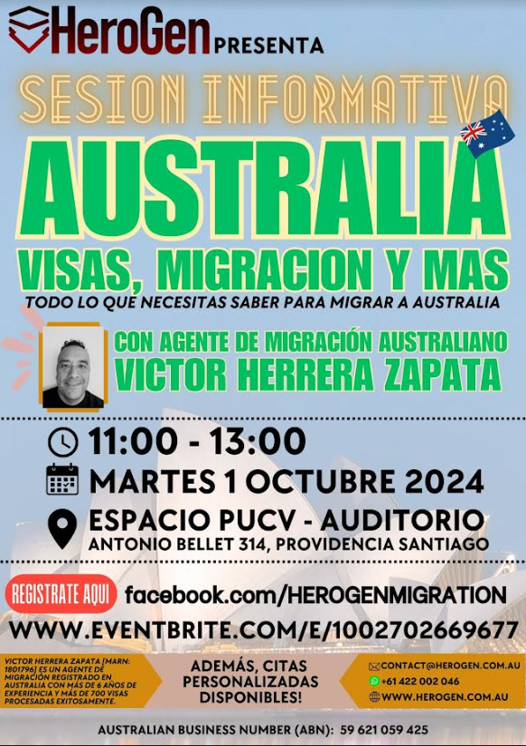 HeroGen Australia presenta sesion informativa sobre todo lo que necesitas saber para migrar a Australia. El agente migratorio registrado en Australia, Victor Herrera presentara todo la informacion mas actualizada en relacion a visas australiana, sistema migracion, y vias a residencia. También habra la oportunidad para agendar citas personalizadas .