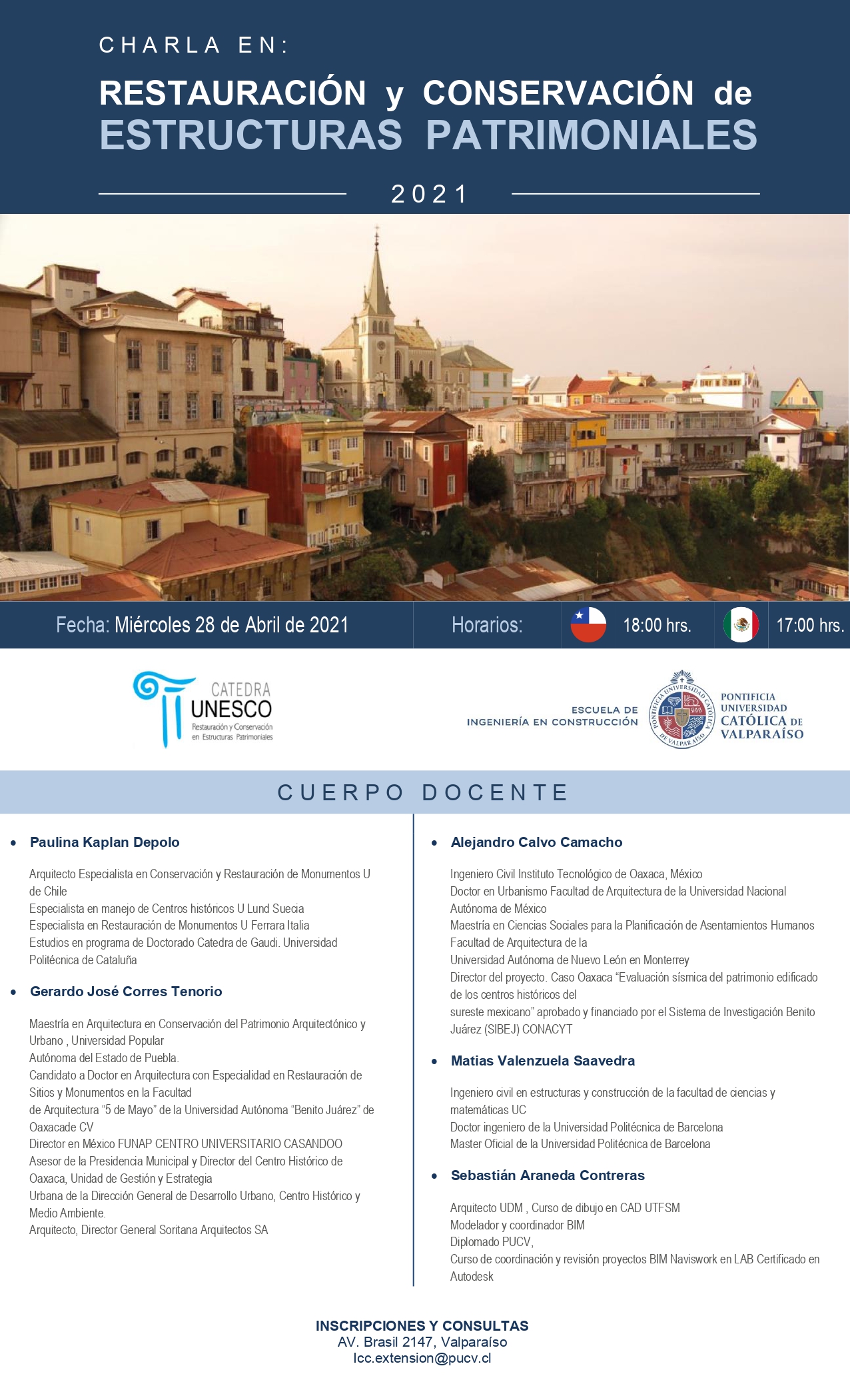 La Escuela de Ingeniería en Construcción PUCV le invita a participar de la Charla en Restauración y Conservación de Estructuras Patrimoniales la cual se desarrollará durante el día miércoles 28 de abril.