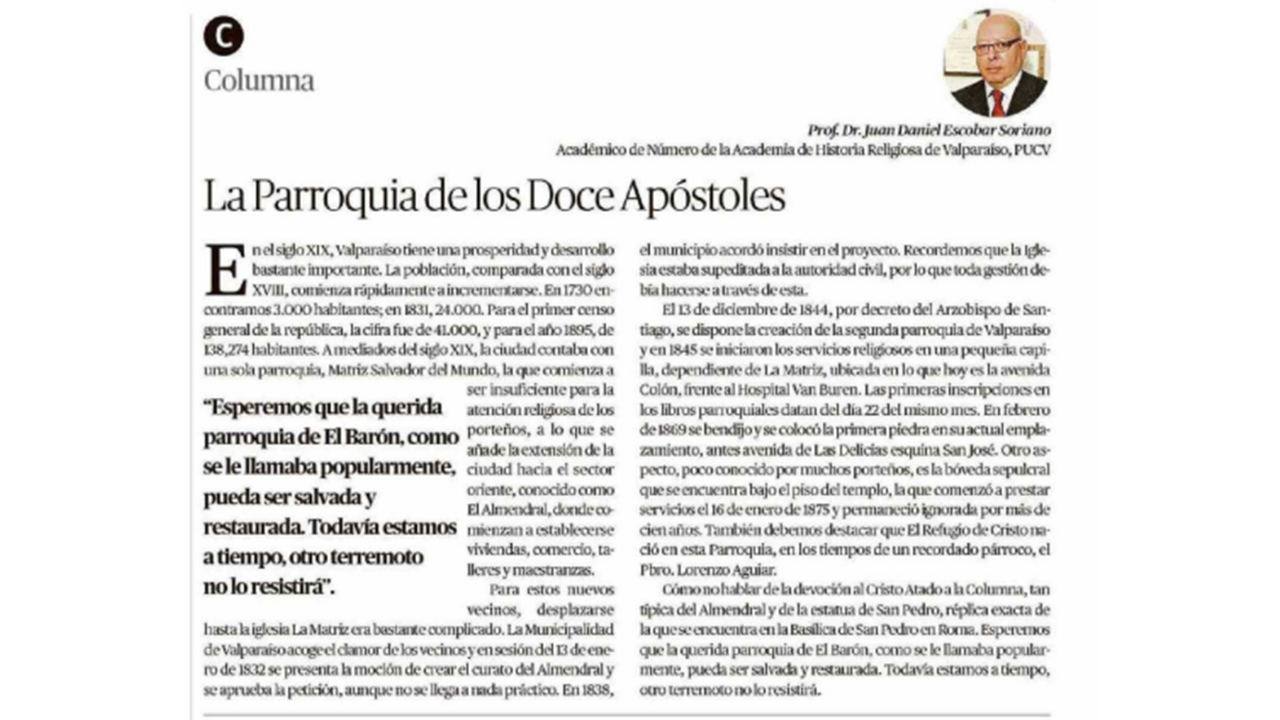 Usted está en: Portada | Facultad de Teología | Noticias Columna Prof. Juan Daniel Escobar: La Parroquia de los Doce Apóstoles Twittear subir volver
