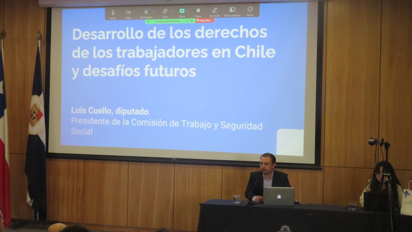 Por su parte, el diputado de la República por el Distrito 7, Luis Cuello Peña y Lillo, ofreció una charla magistral sobre la evolución de los derechos laborales en Chile. Presentó las transformaciones que han tenido las leyes laborales desde las primeras menciones en el Código Civil de 1855, pasando por la Cuestión Social, la promulgación del Código del Trabajo, los impactos de la dictadura y los avances del período actual de gobierno.