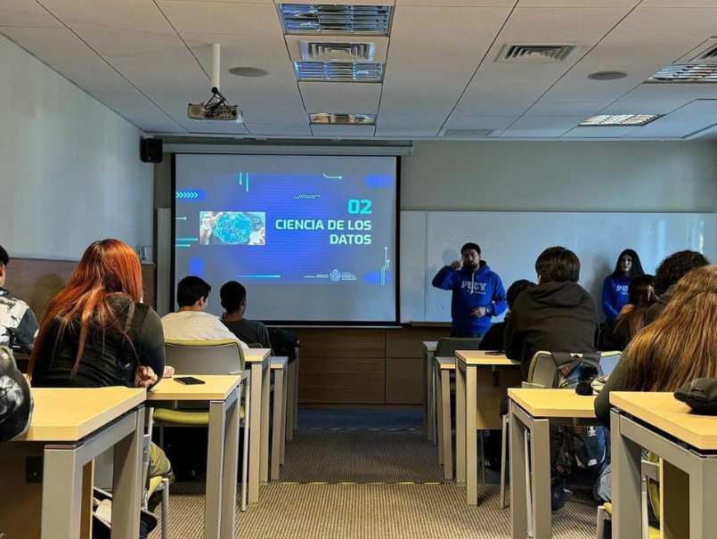Descripción de imagen: Estudiantes en clase Propedéutico eje ingeniería Santiago 2024. Se ve presentación en power point titulada "Ciencia de los Datos".