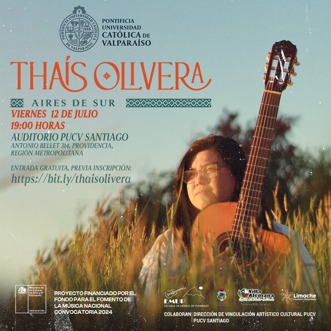 La música ligada a los ritmos folclóricos sureños hará resonar los espacios del auditorio de PUCV Santiago a través de los sonidos que Thaís Olivera presentará este viernes 12 de julio. La multiinstrumentista, cantante e intérprete osornina realizará el primer concierto de la temporada en la sede santiaguina de nuestra Casa de Estudios.