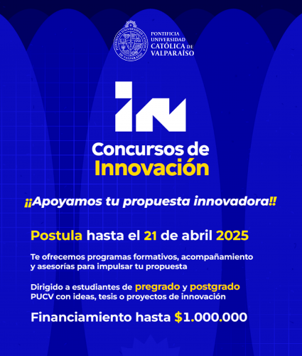 La Vicerrectoría de Investigación, Creación e Innovación, a través de la Dirección de Innovación de la Pontificia Universidad Católica de Valparaíso (PUCV), invita a estudiantes de pregrado y postgrado a participar en los Concursos de Innovación 2025. Esta iniciativa busca apoyar propuestas innovadoras en distintas etapas de desarrollo, ofreciendo formación, asesoría y financiamiento de hasta $1.000.000, dependiendo de la categoría.