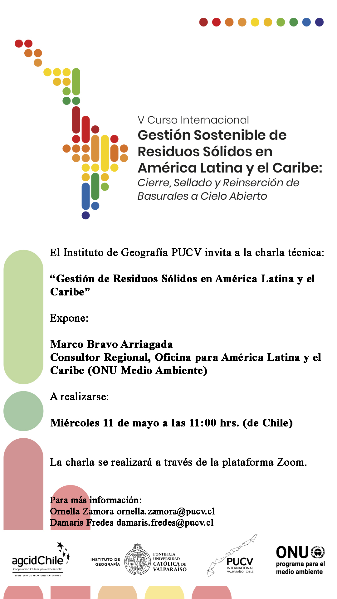 Como parte de las actividades vinculantes del Curso, este miércoles 11 de mayo, a las 11 horas (Chile), se llevará a cabo la primera charla técnica “Gestión de Residuos Sólidos en América Latina y el Caribe”, la cual contará con la exposición del coordinador logístico del Curso, Marco Bravo.