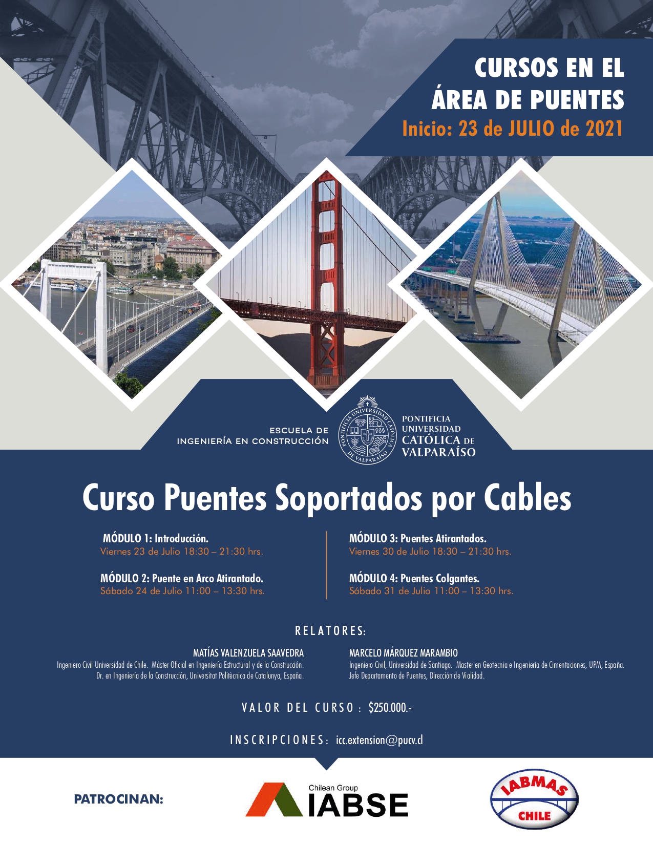 Usted está en: Portada | Escuela de Ingeniería en Construcción Curso Puentes Soportados por Cables Fecha de Inicio; 23 de julio de 2021 Valor del Curso : $250.000 afsssss Twittear subir volver