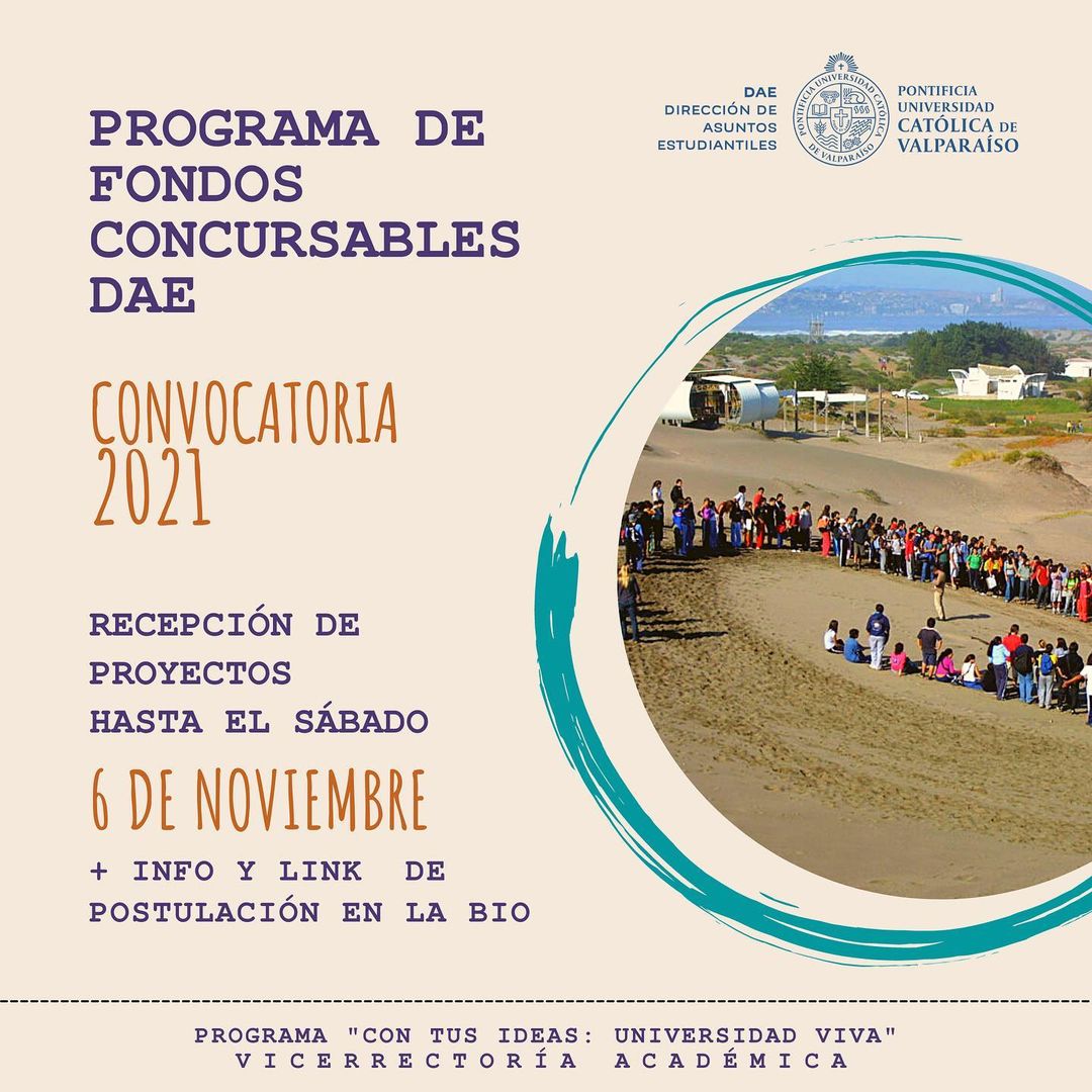 La Vicerrectoría Académica de la Pontificia Universidad Católica de Valparaíso, a través de su Dirección de Asuntos Estudiantiles, hace un llamado a la comunidad universitaria para presentar iniciativas al programa de Fondos Concursables “Con Tus Ideas: Universidad Viva”, en su convocatoria 2021.