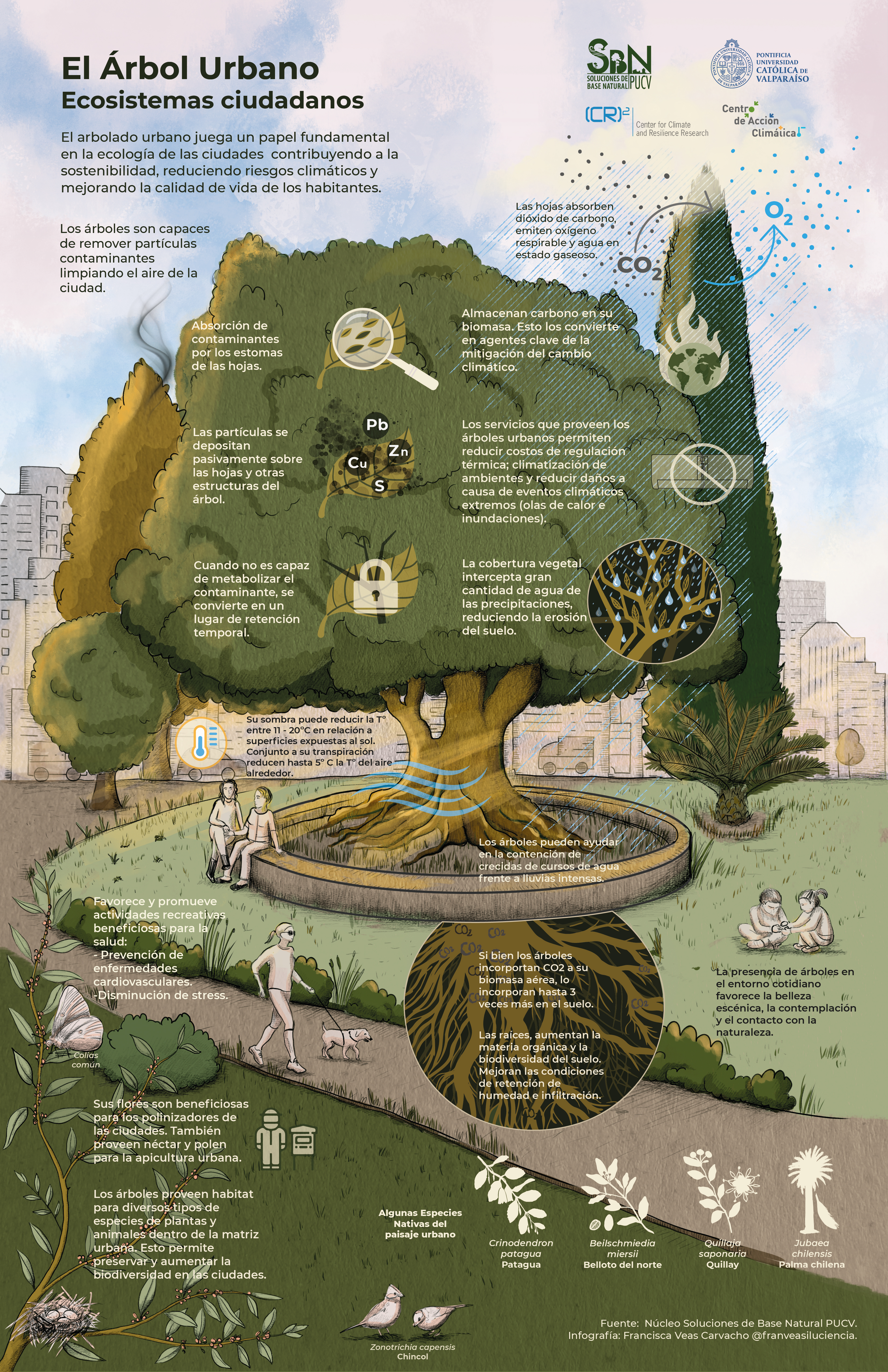 Esta colaboración fue realizada por la ilustradora científica Francisca Veas Carvacho (https://franciscaveas.cl/) junto al equipo de investigación del Núcleo de Soluciones de Base Natural (N2S) PUCV, el Centro de Acción Climática PUCV y el Laboratorio de Dendrocronología y Estudios Ambientales de la Pontificia Universidad Católica de Valparaíso. Esta infografia también fue adaptada por Emol bajo el título: “La importancia del árbol urbano”.