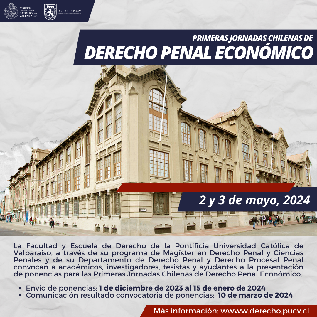 La Facultad y Escuela de Derecho de la Pontificia Universidad Católica de Valparaíso, a través de su programa de Magíster en Derecho Penal y Ciencias Penales y de su Departamento de Derecho Penal y Derecho Procesal Penal convocan a académicos, investigadores, tesistas y ayudantes a la presentación de ponencias para las Primeras Jornadas Chilenas de Derecho Penal Económico. Dicha actividad tendrá lugar en la ciudad de Valparaíso, los días 2 y 3 de mayo de 2024 y se realizará con ocasión del centésimo trigésimo aniversario del Curso de Leyes de los SSCC de Valparaíso, con el que se funda dicha Escuela de Derecho. Las ponencias deberán referirse a alguno de los ejes temáticos de las jornadas y serán evaluadas por el Comité Académico, que estará integrado por profesores del Departamento de Derecho Penal y Derecho Procesal Penal de la PUCV, el cual comunicará a los interesados si la ponencia respectiva podrá ser expuesta en dichas jornadas.