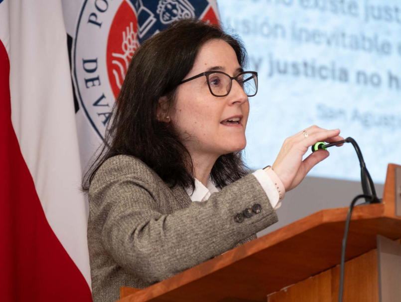 Tras la actuación del Coro de Cámara de la Pontificia Universidad Católica de Valparaíso y las palabras de bienvenida del profesor Aldunate, se dio paso al punto culminante de la ceremonia: la destacada presencia de la profesora Eva Tobalina Oráa, doctora en Historia Antigua por la Universidad de Navarra. La académica española dictó la clase inaugural, titulada "Reflexiones sobre el concepto de ley y justicia en la Antigüedad”, una disertación que cautivó a todos los presentes y que promete dejar una huella profunda en el pensamiento jurídico de la comunidad académica de Derecho PUCV.