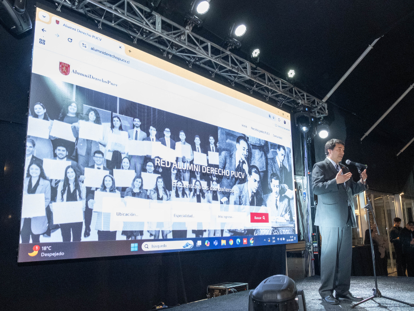 Uno de los momentos destacados de la noche, fue la presentación de la nueva plataforma Alumni Derecho PUCV, a cargo del profesor y jefe de Vinculación con el Medio de la Facultad, José Luis Guerrero. El sitio web, accesible en https://alumniderechopucv.cl/, tiene como objetivo construir una red sólida de abogados PUCV, brindando una herramienta de apoyo mutuo y permitiendo la conexión entre exalumnos para distintos requerimientos laborales y profesionales.