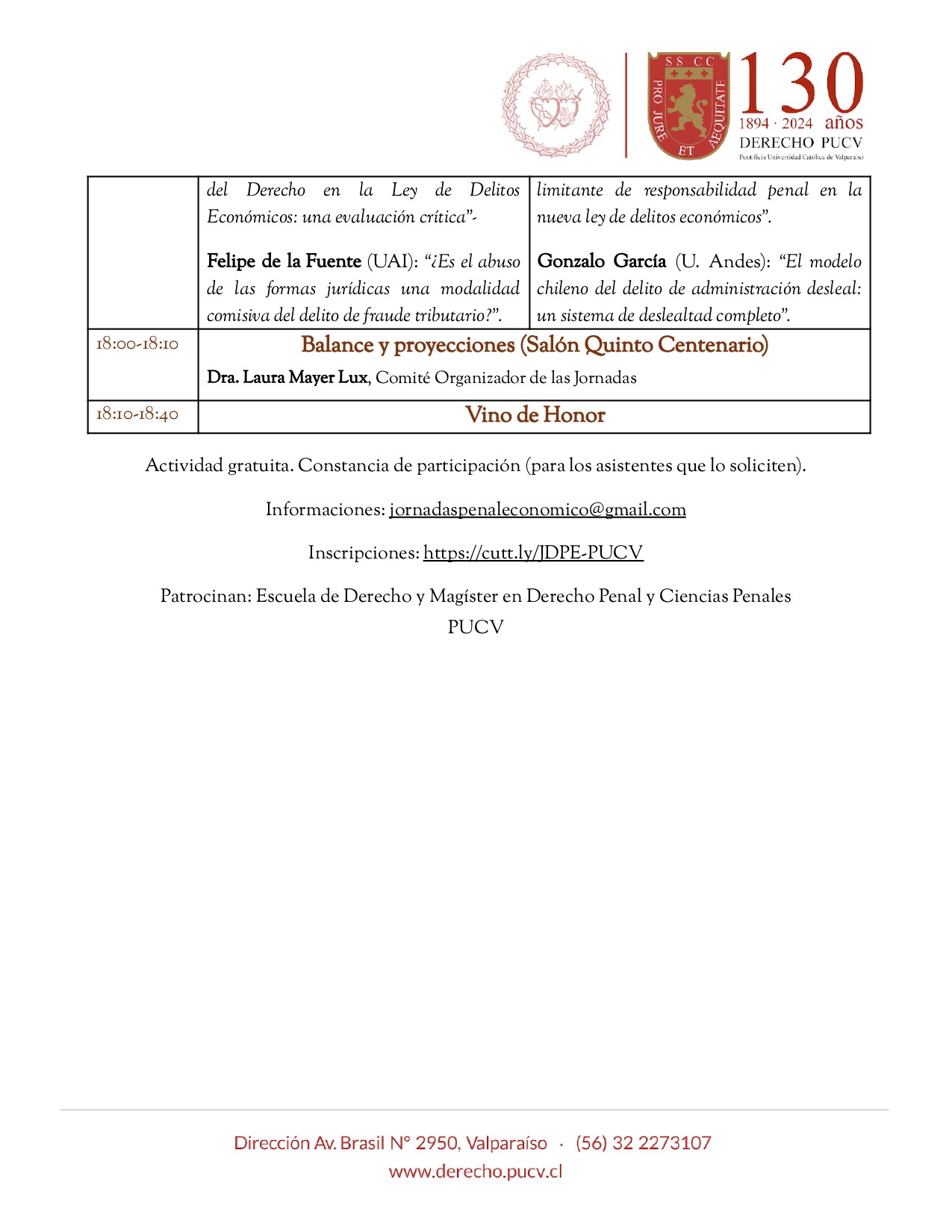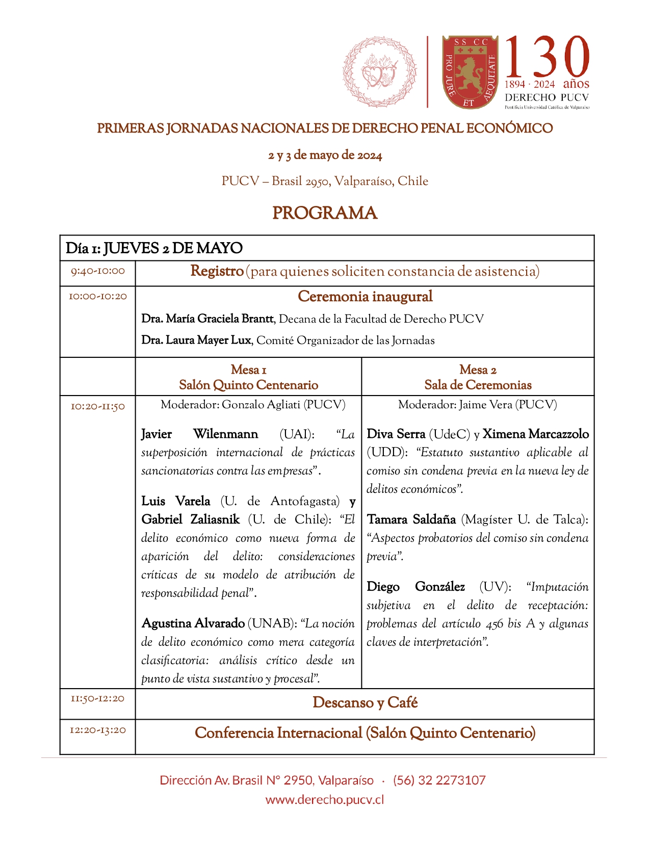 La Facultad y Escuela de Derecho de la Pontificia Universidad Católica de Valparaíso, a través de su programa de Magíster en Derecho Penal y Ciencias Penales y de su Departamento de Derecho Penal y Derecho Procesal Penal, llevarán a cabo las Primeras Jornadas Chilenas de Derecho Penal Económico.
