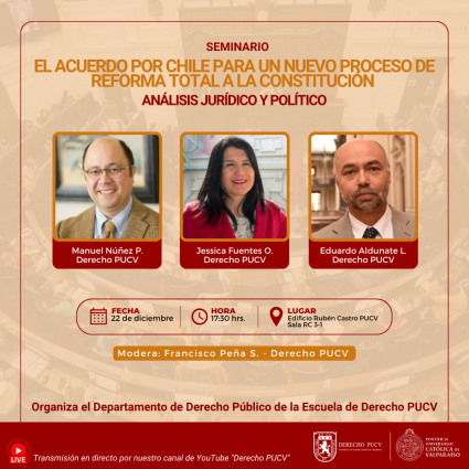 Nuestro Departamento de Derecho Público llevará a cabo este jueves 22 de diciembre, a las 17:30 hrs., el seminario "El Acuerdo por Chile para un nuevo proceso de reforma total a la constitución. Análisis jurídico y político".