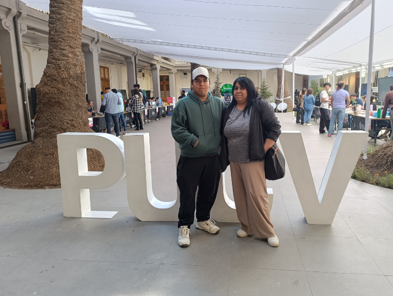 Descripción de imagen: Cristóbal posa frente a letras PUCV junto a su madre Lucy Alquinta, en patio de Casa Central PUCV.