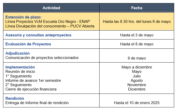 La Coordinación General de Vinculación con el Medio extiende el plazo de postulación al Fondo Concursable 2024 hasta las 8.30 hrs. del lunes 6 de mayo para las siguientes líneas de financiamiento: