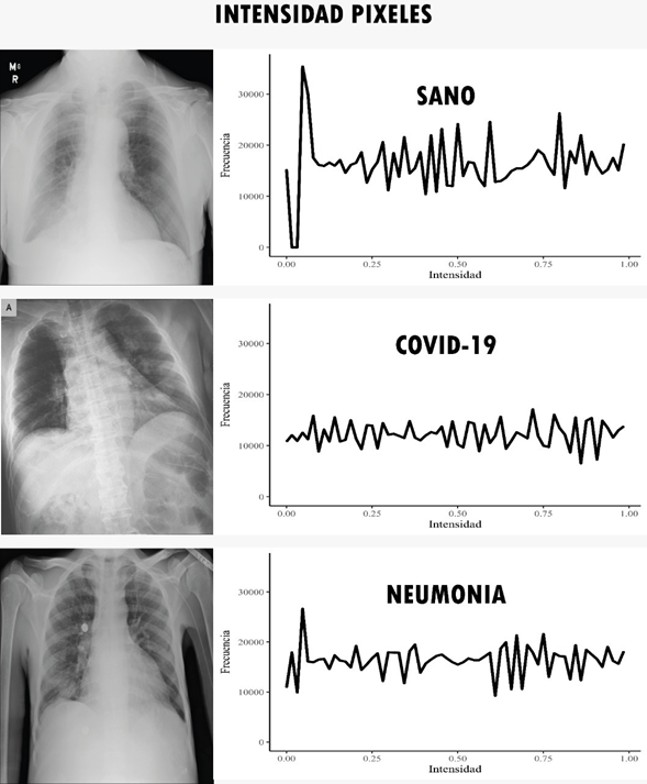 Estas imágenes corresponden a datos no estructurados que se les da estructura transformando la intensidad de pixeles, y otras características de la imagen, en datos estructurados, que se pueden analizar, tal como se ve en la imagen de abajo. Cuando los datos están estructurados, se le aplica las técnicas de AA llamadas máquinas de vectores de soporte y bosques aleatorios para obtener la predicción como paciente sano, con neumonía o con COVID-19.