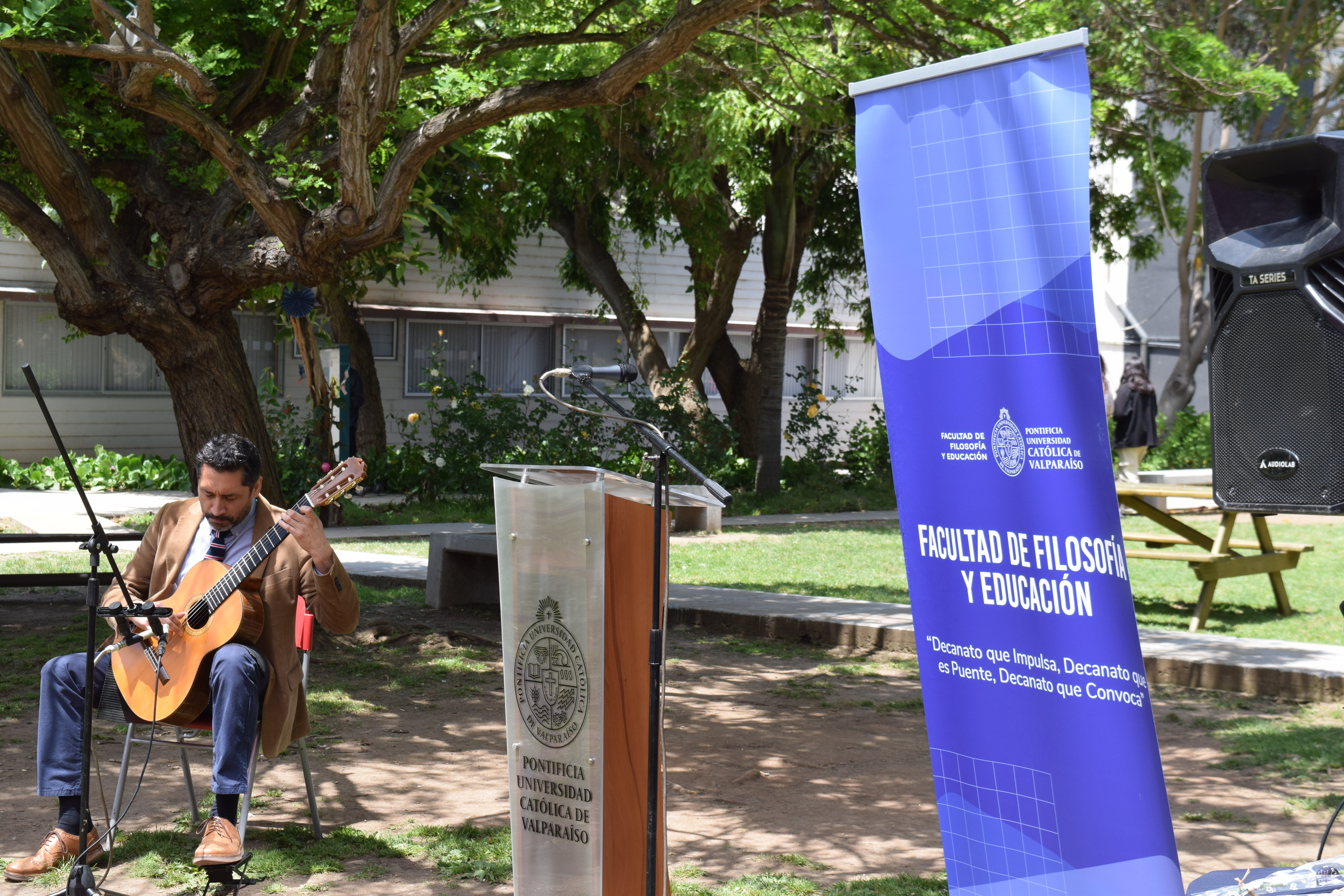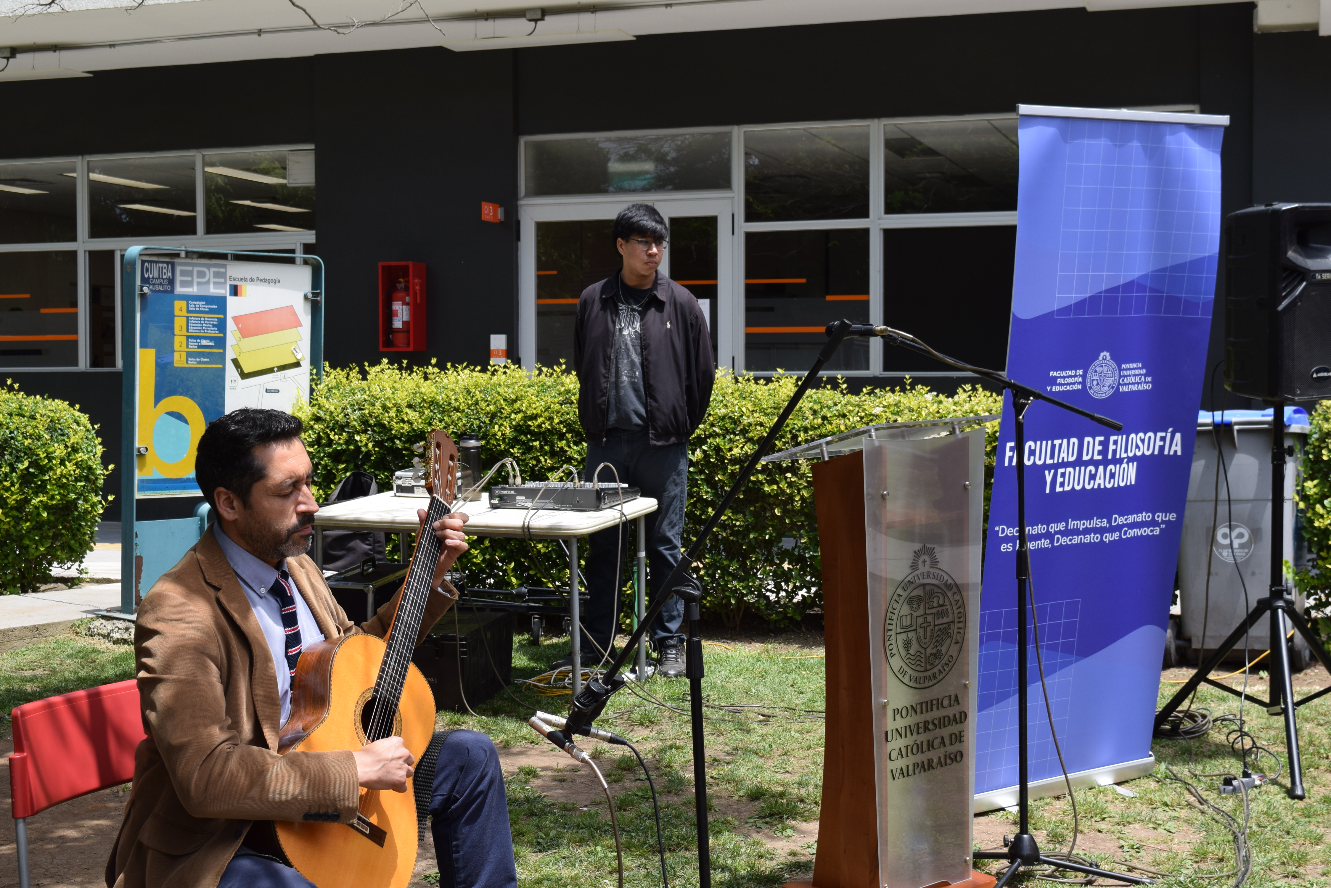 A mitad de la actividad, el académico del Instituto de Música, Esteban Espinoza, cautivó al público con dos interpretaciones musicales de Víctor Jara y Juan Antonio Sánchez.
