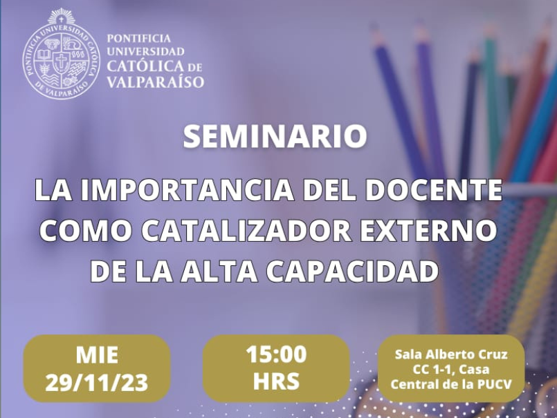 Este martes 29 de noviembre, a las 15 horas, se llevará a cabo el seminario titulado "La importancia del docente como catalizador externo de la alta capacidad", evento que se realizará en la Sala Alberto Cruz (1-1), ubicada en la Casa Central de nuestra Universidad y organizado por nuestra dirección a través del programa BETA.