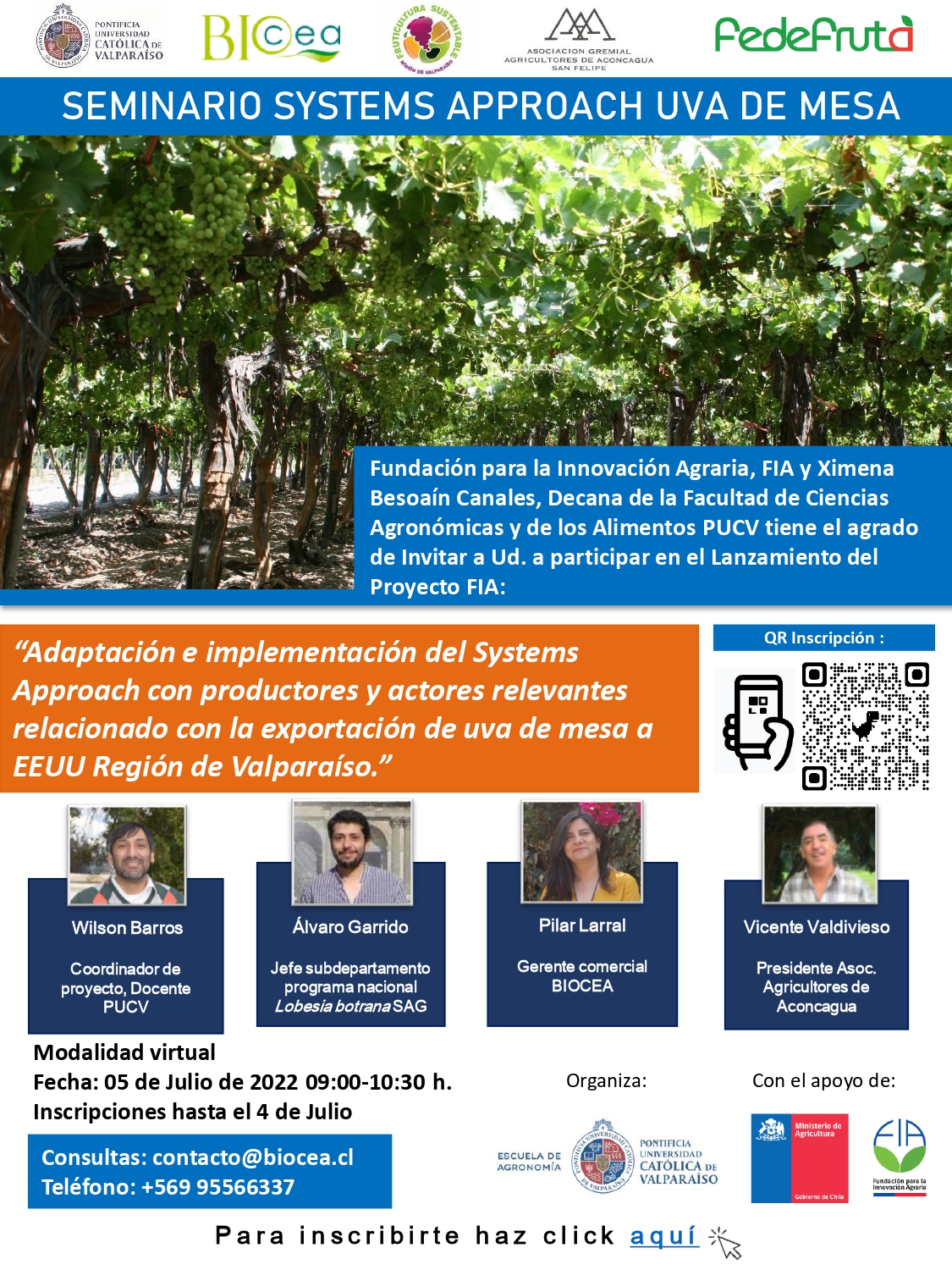 El próximo martes 5 de julio a las 9:00 horas, se realizará el Seminario “Systems Approach Uva de Mesa”, en el cual se dará lugar al lanzamiento del Proyecto FIA "Adaptación e implementación del Systems Approach con productores y actores relevantes relacionado con la exportación de uva de mesa a EEUU, Región de Valparaíso", liderado por el profesor Wilson Barros, Académico de la Escuela de Agronomía PUCV.