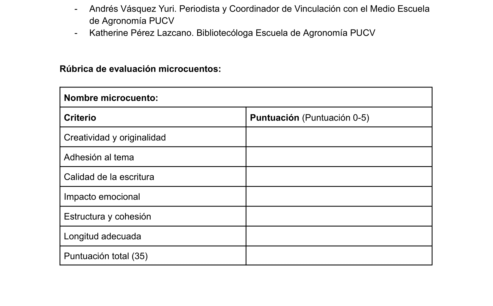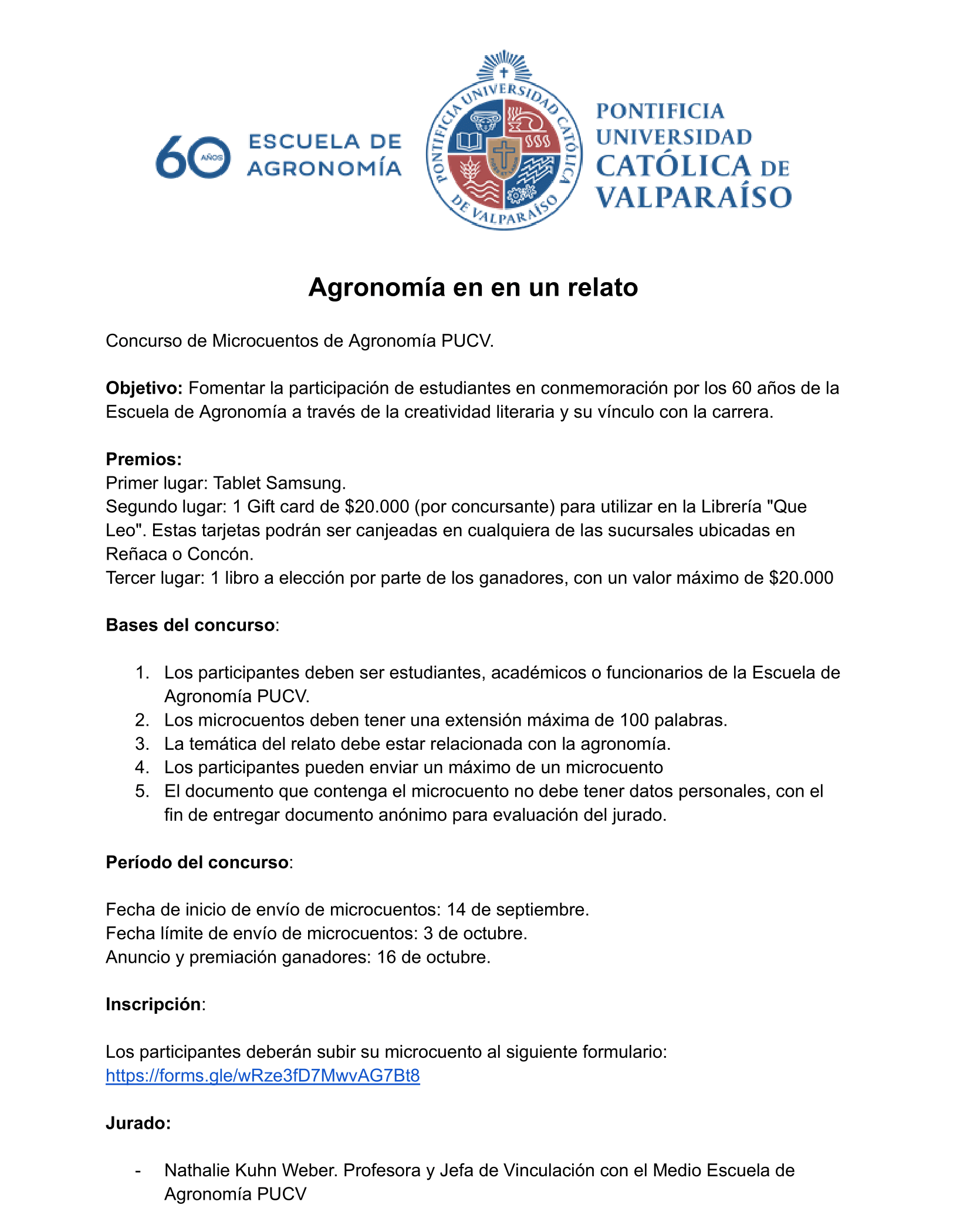 Este concurso está abierto a estudiantes, funcionarios y académicos de la Escuela de Agronomía PUCV, invitándolos a compartir sus historias en formato de microcuento con una sola regla: que la temática sea relacionada con la agronomía en un relato de no más de 100 palabras.