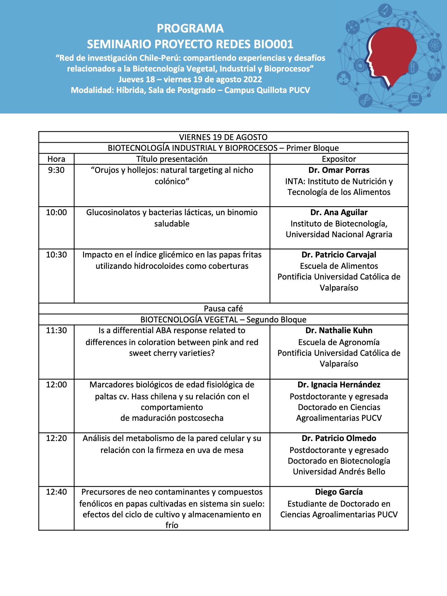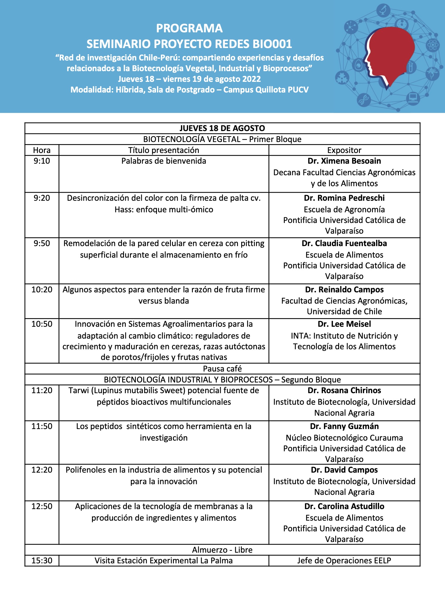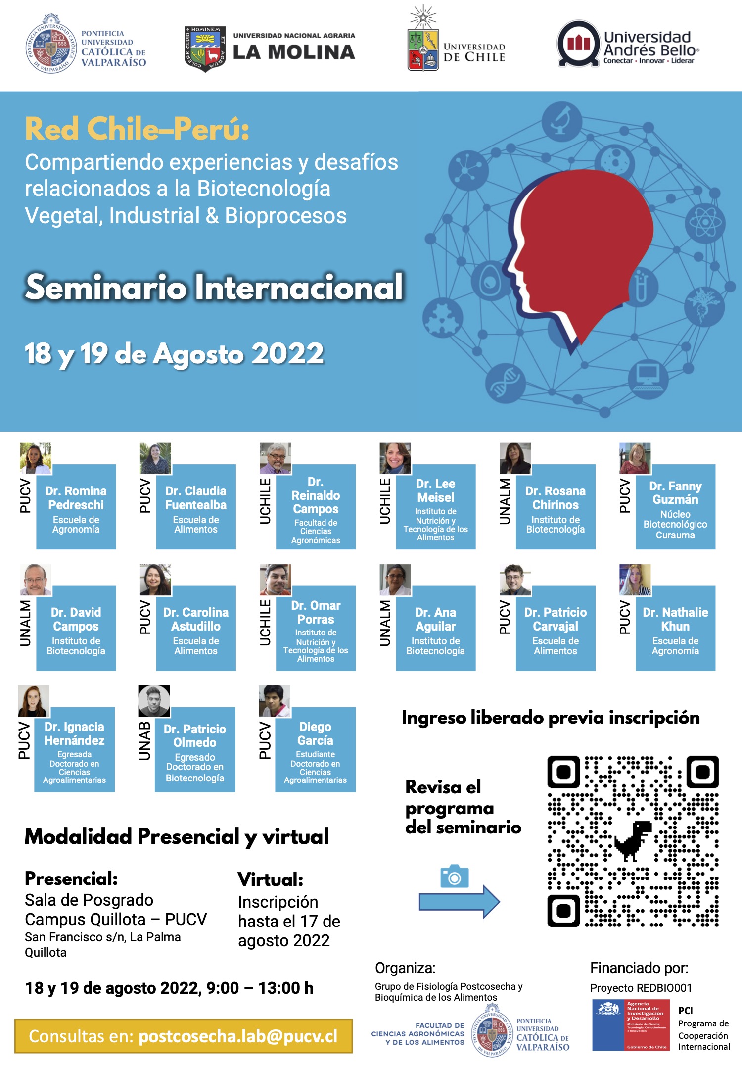 El Seminario cuenta con invitados internacionales incluyendo destacados investigadores de la Universidad Nacional Agraria La Molina (UNALM, Perú), además de científicos de la PUCV, UCHILE y UNAB. Este se realizará el 18 y 19 de agosto entre las 09:00 y las 13:00 horas de manera presencial -Sala de Postgrado Campus Quillota PUCV- y virtual, con inscripciones hasta el 17 de agosto.