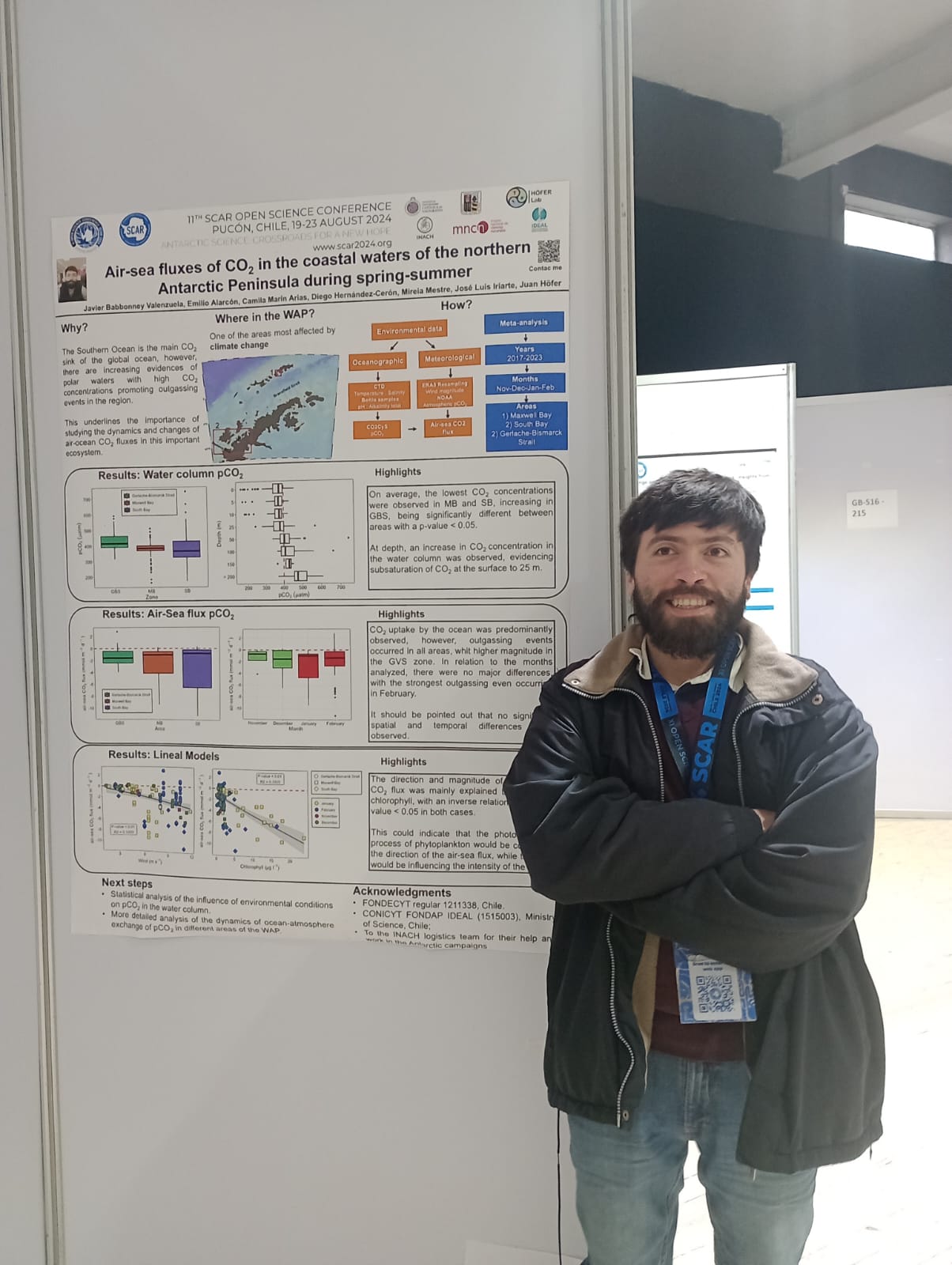 - Javier Babbonney destacó con su póster "Air-Sea Fluxes of CO2 in the Coastal Waters of the Northern Antarctic Peninsula during Spring-Summer", en el que presentó datos sobre los flujos de CO2 entre el mar y la atmósfera en las aguas costeras de la Península Antártica. Asimismo, Javier impartió una charla titulada "Potential Effects of Climate Change on the Reproductive Success of Salpa thompsoni and Euphausia superba: A Circumpolar Estimation using Individual-Based Models", donde analizó los posibles efectos del cambio climático en el éxito reproductivo de especies clave del ecosistema antártico, como la salpa y el kril, utilizando modelos basados en individuos.