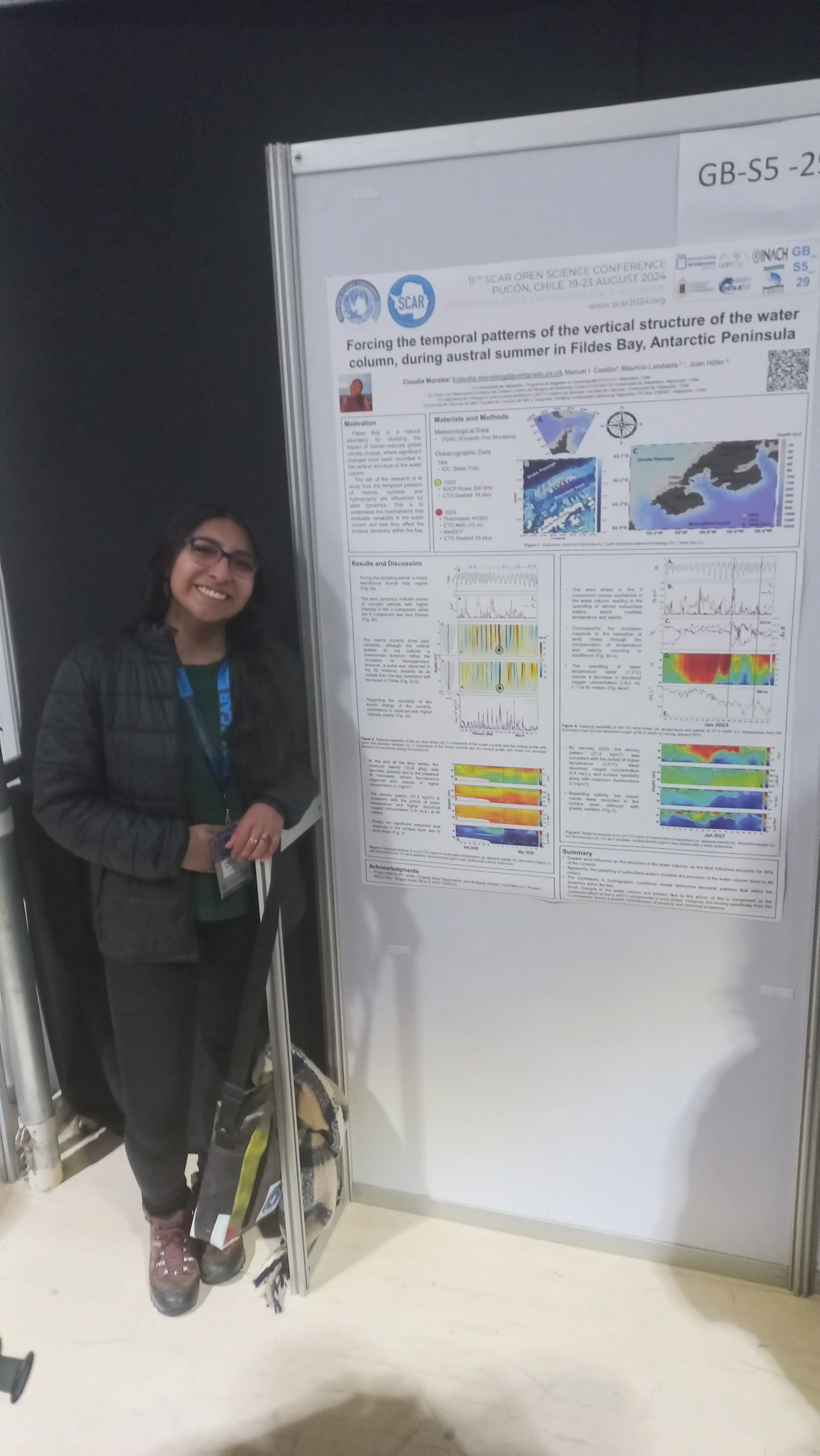 - Claudia Morales presentó su póster "Forcing the Temporal Patterns of the Vertical Structure of the Water Column during Austral Summer in Fildes Bay, Antarctic Peninsula", en el que estudió los patrones temporales de la estructura vertical de la columna de agua durante el verano austral en la Bahía Fildes.