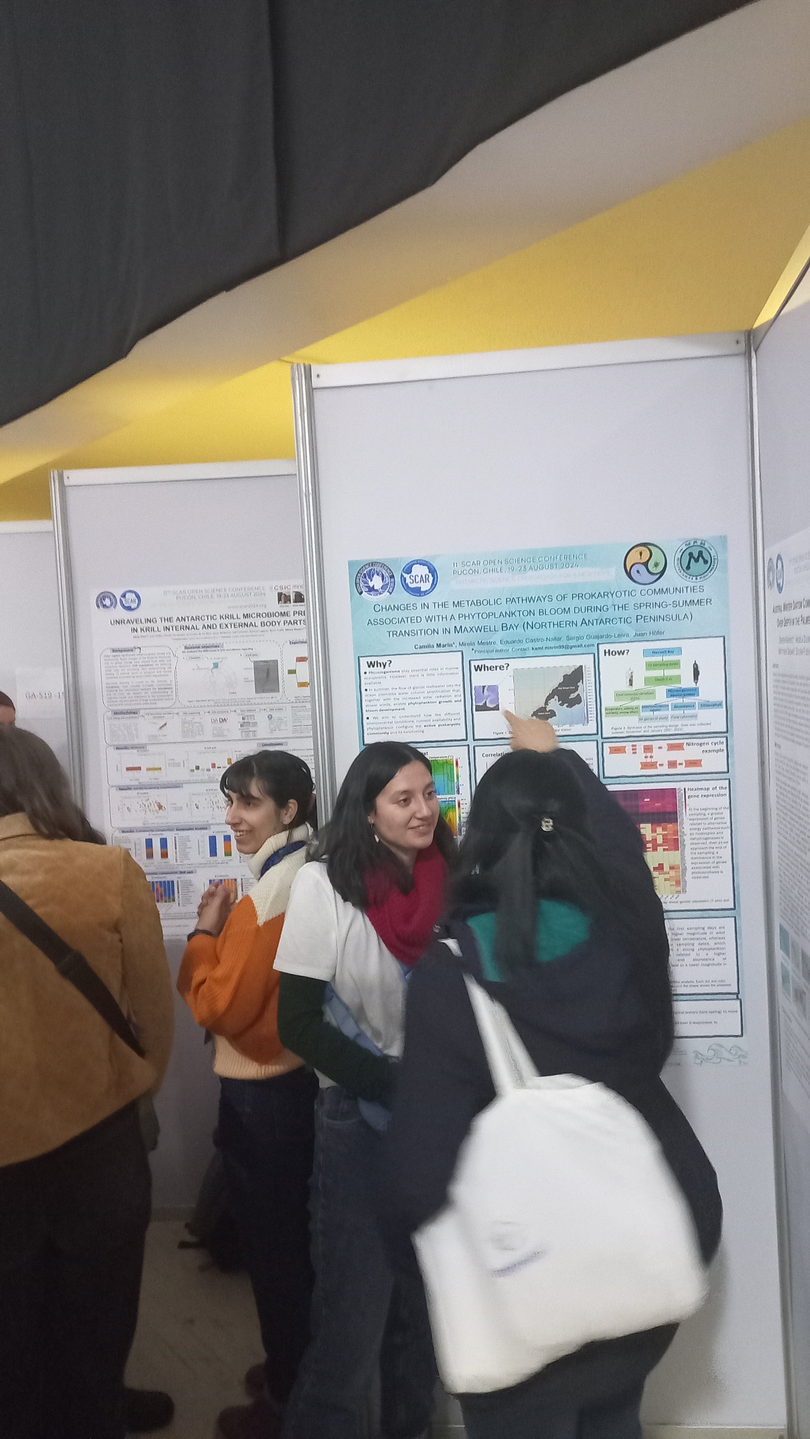 - Camila Marín presentó dos pósteres. El primero, titulado "Changes in the Metabolic Pathways of Prokaryotic Communities Associated with a Phytoplankton Bloom during the Spring-Summer Transition in Maxwell Bay (Northern Antarctic Peninsula)", explora las alteraciones en las rutas metabólicas de las comunidades procariotas en respuesta a los florecimientos de fitoplancton en la Bahía Maxwell. El segundo, "Diversity and Abundance of Prokaryotes in Antarctica: The Effect of Oceanography in the Bransfield Strait", se centró en cómo la oceanografía de la Estrecho de Bransfield influye en la diversidad y abundancia de procariontes.