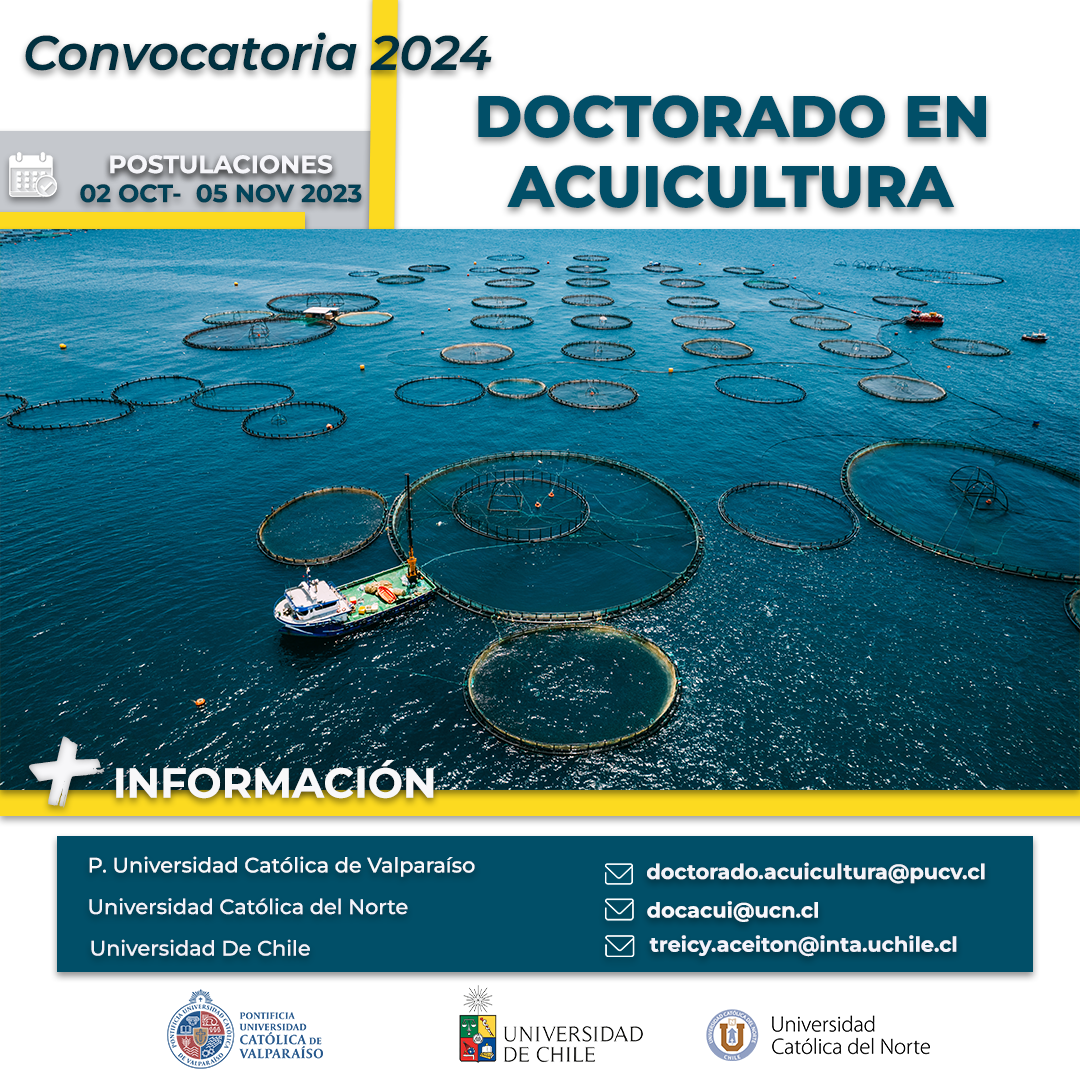 El lunes 2 de octubre se da inicio a las postulaciones en línea para la nueva versión del Doctorado en Acuicultura, impartido por la Escuela de Ciencias del Mar de la Pontificia Universidad Católica de Valparaíso, en conjunto con la Universidad de Chile y la Universidad Católica del Norte.