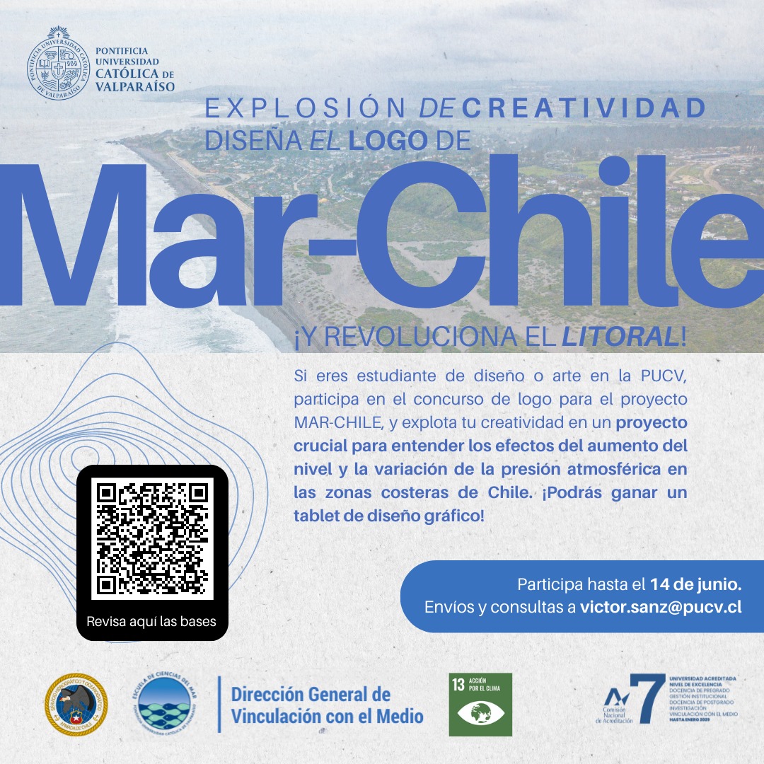 Organizado por la PUCV, a través de la Escuela de Ciencias del Mar y la Dirección General de Vinculación con el Medio, invitamos a estudiantes de cualquier año de las carreras de diseño y arte de la PUCV, a participar en el concurso “Explosión de creatividad: Diseña el logo de Mar-Chile y revoluciona el litoral”.