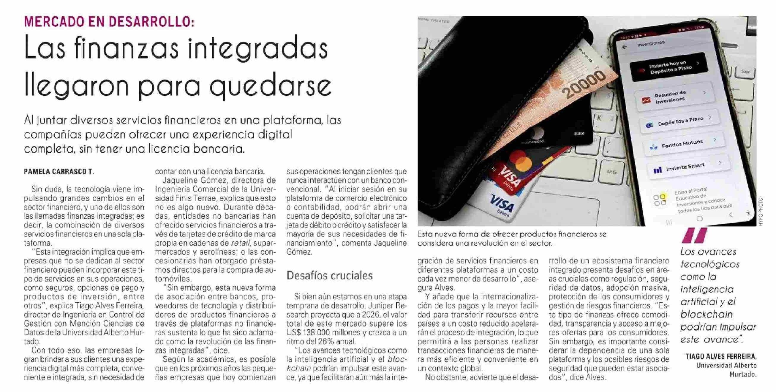 - Entrevista al Diario Financiero - Finanzas integradas: cuando las transacciones irrumpen en las plataformas de la vida cotidiana - disponible en https://litoralpress.cl/sitio/Prensa_Texto?LPKey=LVTICSLBJKBBCOYDQX73IVZBO4N22SE2Y7LS4NXK6Z55WROOHLMQ