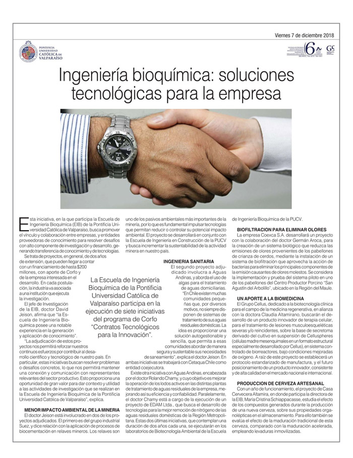La Escuela de Ingeniería Bioquímica (EIB) de la Pontificia Universidad Católica de Valparaíso participa en la ejecución de siete iniciativas del programa de CORFO “Contratos Tecnológicos para la Innovación”, el cual busca promover el vínculo y colaboración entre empresas y entidades proveedoras de conocimiento para resolver desafíos con alto componente de investigación y desarrollo, generando transferencia de conocimiento y de tecnologías.